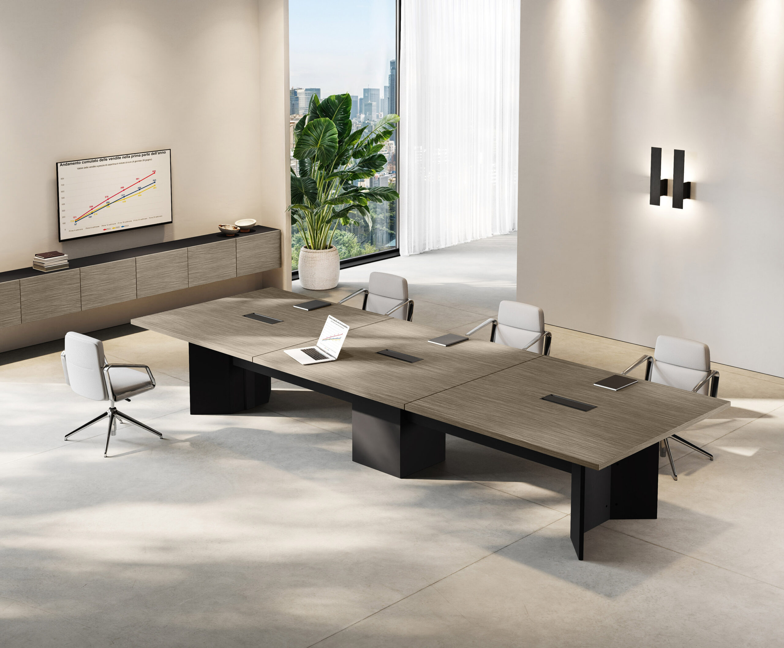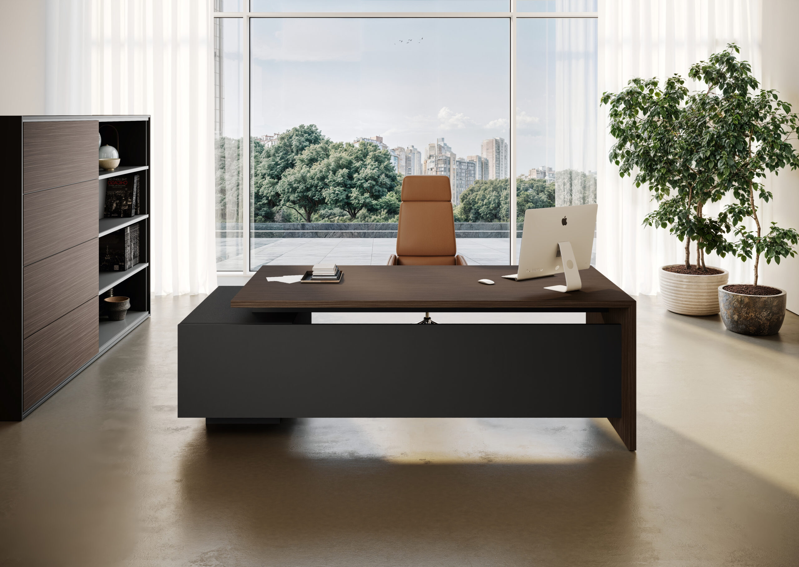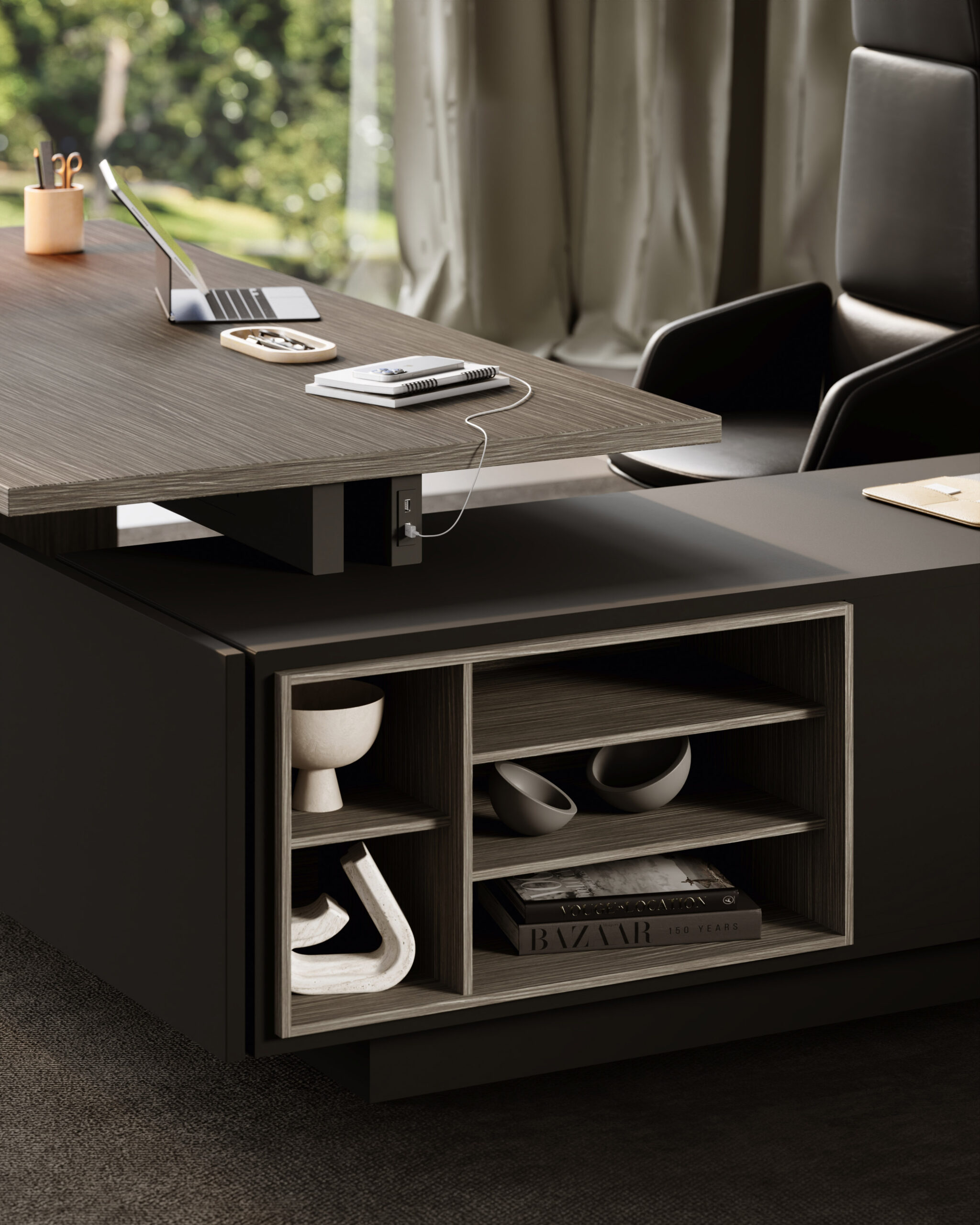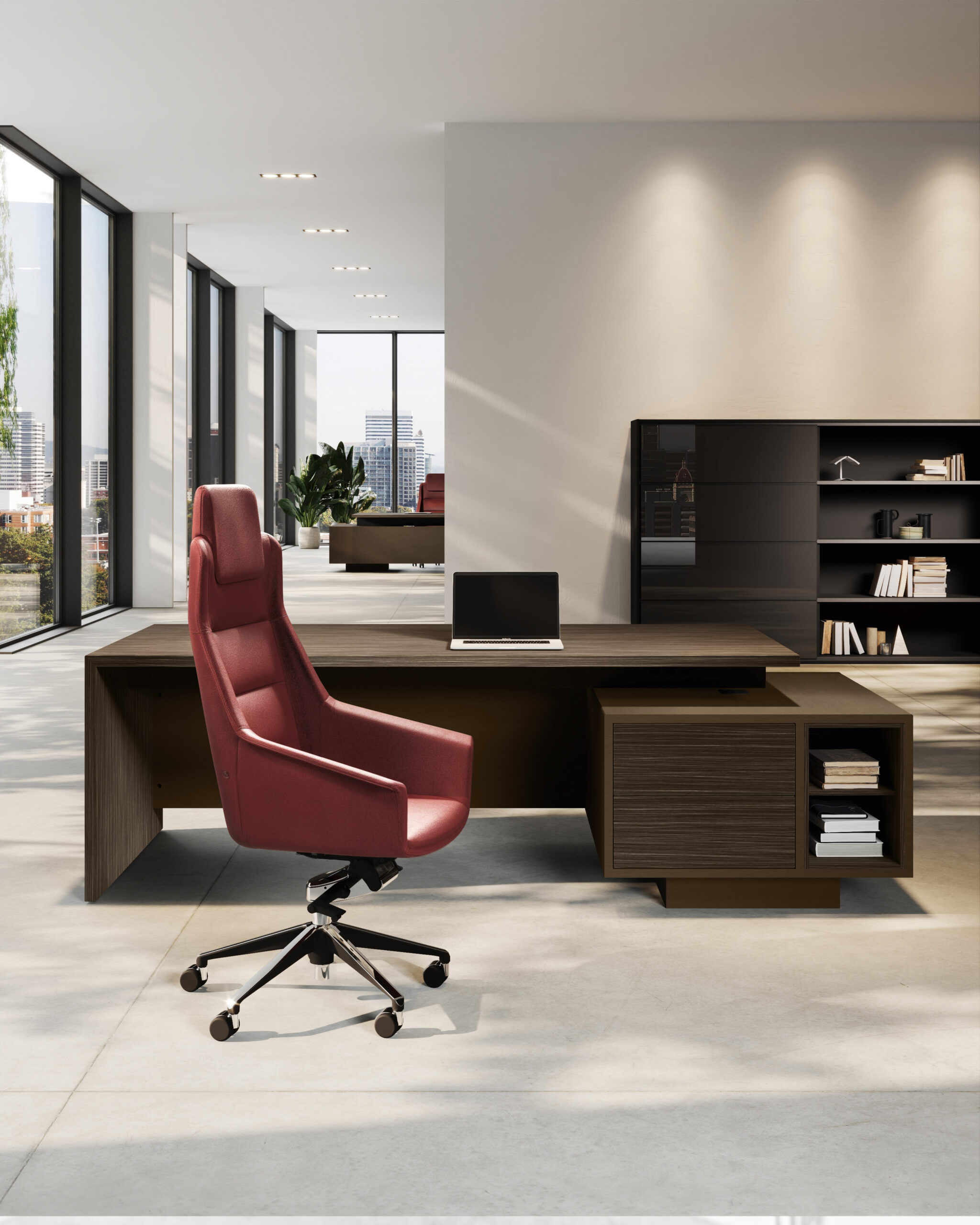 Executive collection where the worktop integrates with the structural base which also has a storage function. The only finishing features are the tops and doors of the drawer unit. A functional workstation embellished by wall panelling with shelves and optional LED lighting.