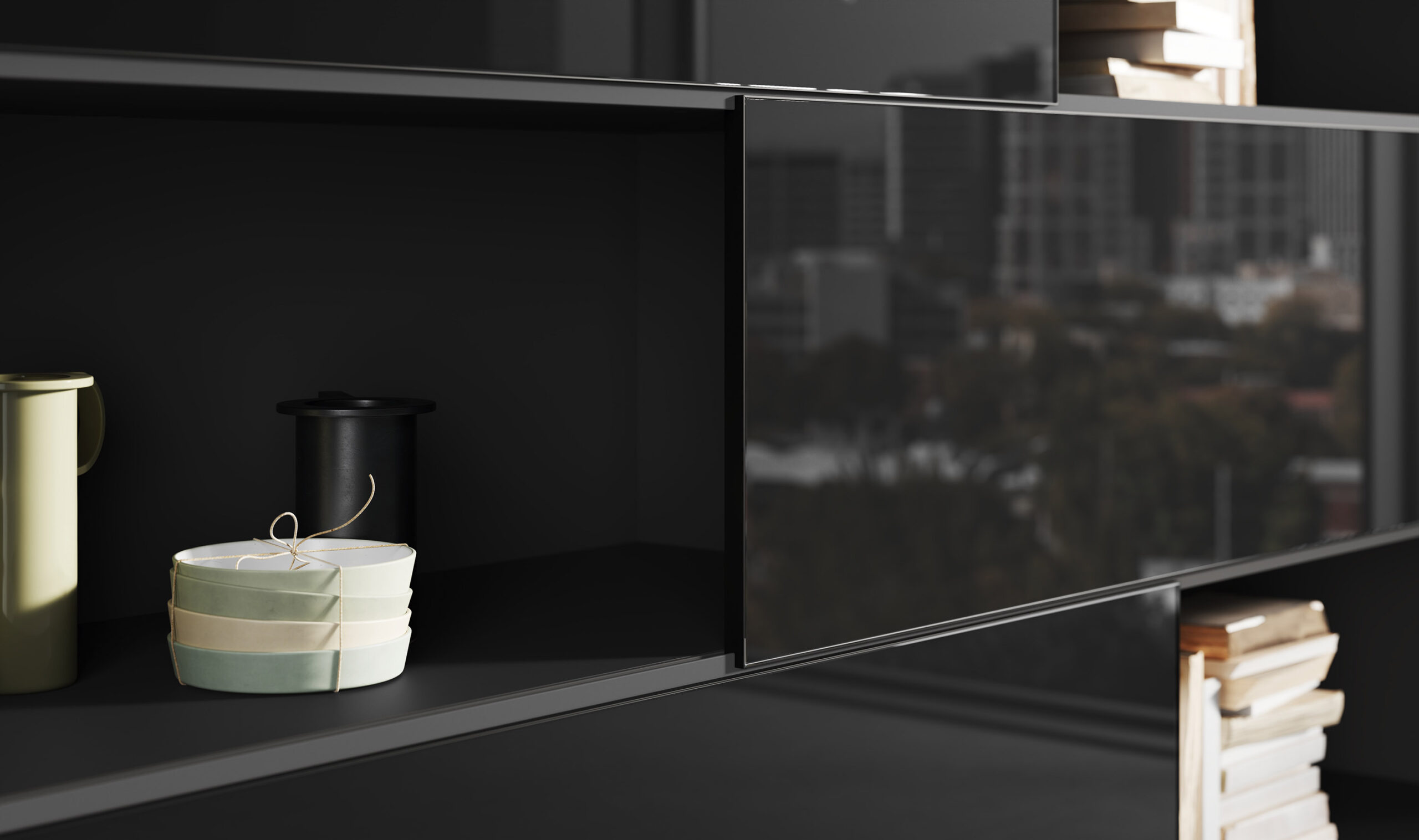 - Two-height storage units with sliding or hinged doors or drawers
