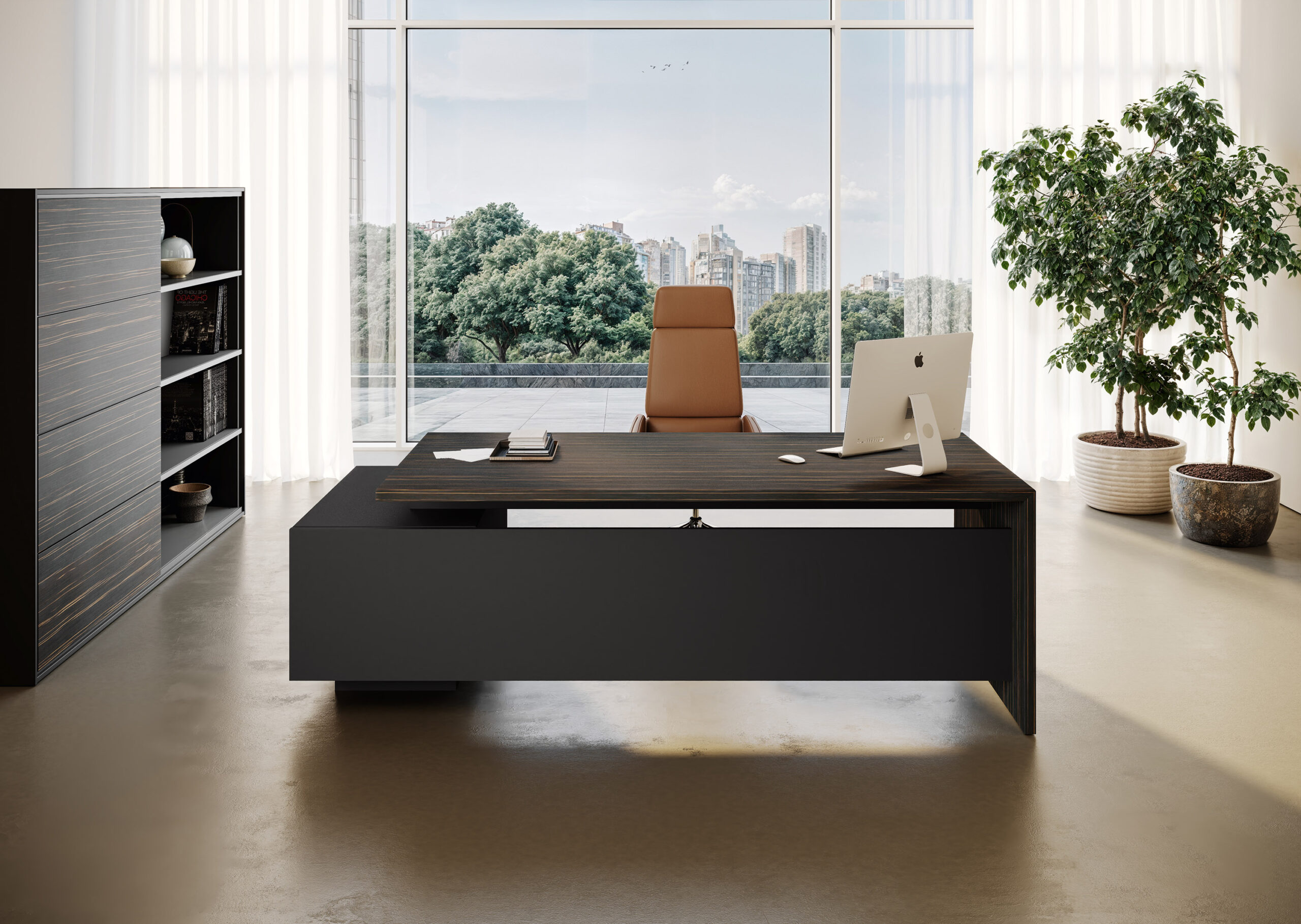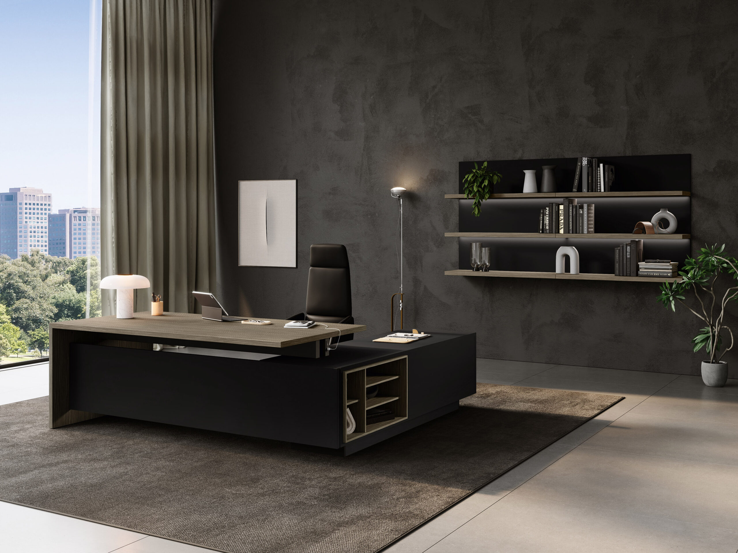 Executive collection where the worktop integrates with the structural base which also has a storage function. The only finishing features are the tops and doors of the drawer unit. A functional workstation embellished by wall panelling with shelves and optional LED lighting.