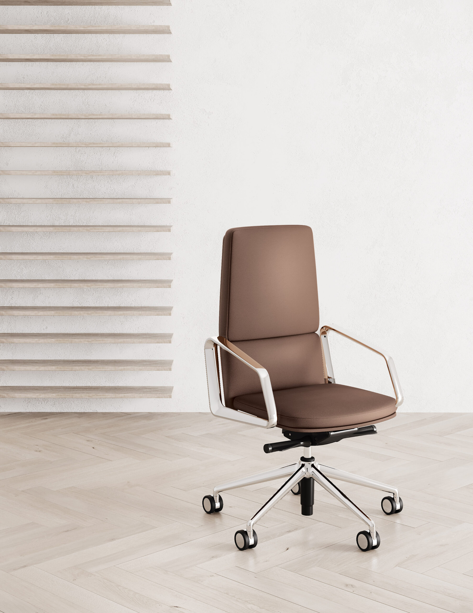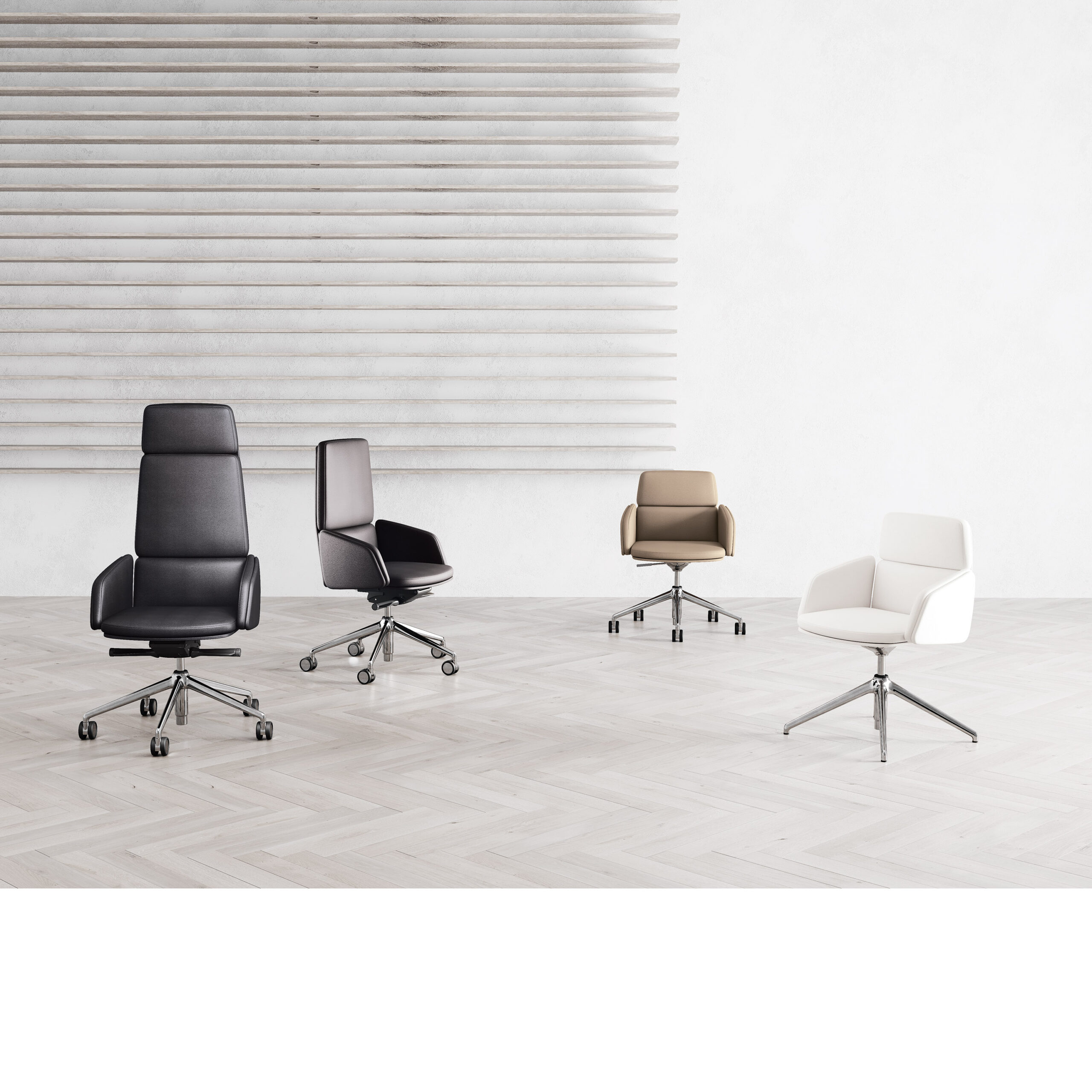 A collection of executive office chairs of great prestige, available in three backrest height options and two options for the armrests, in die-cast aluminium and upholstered.
