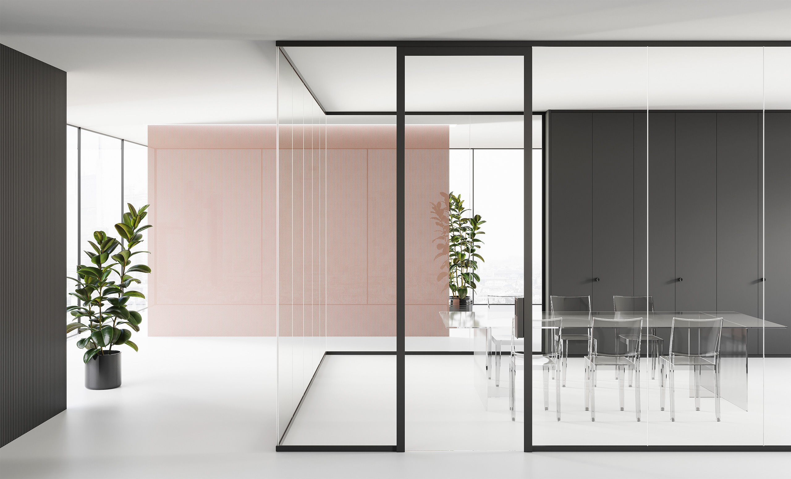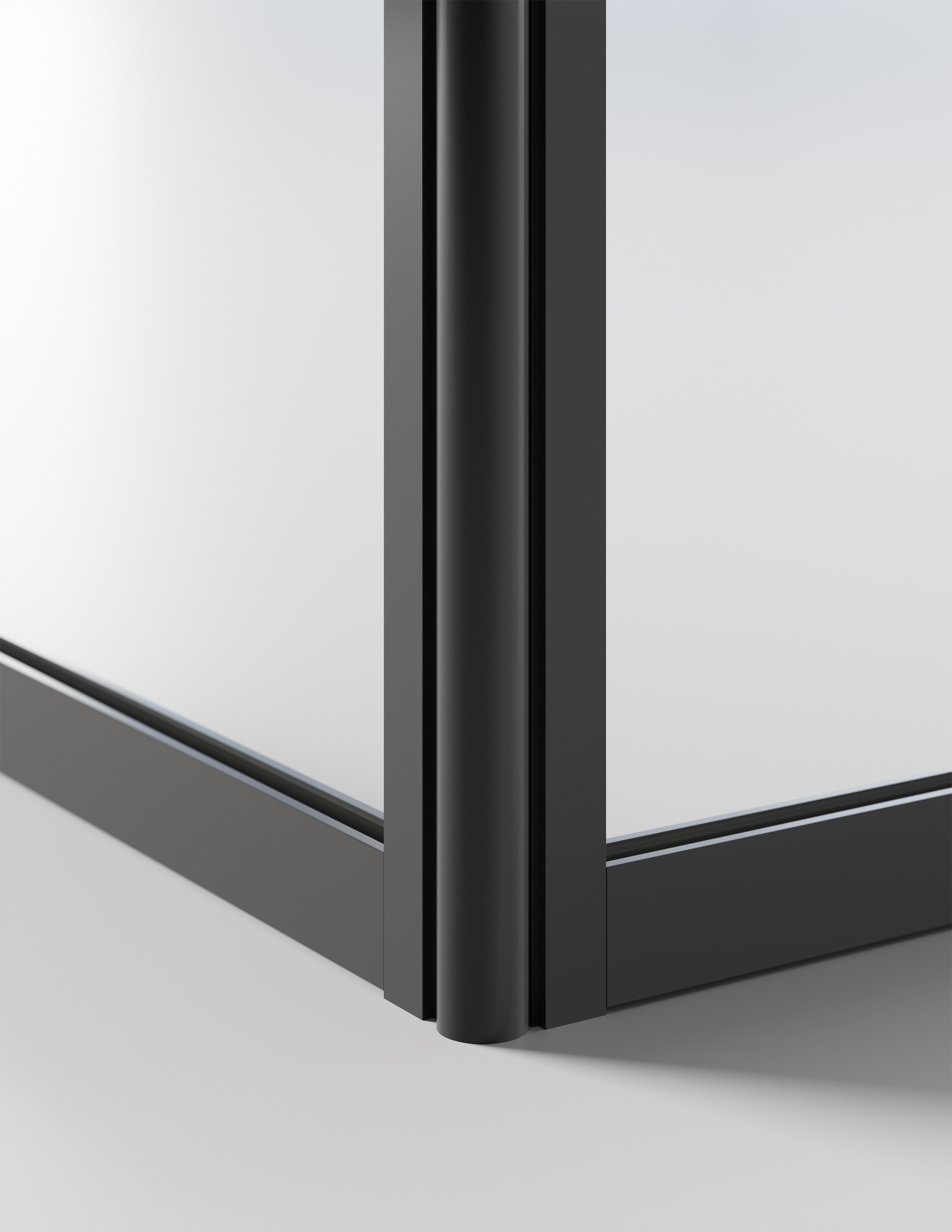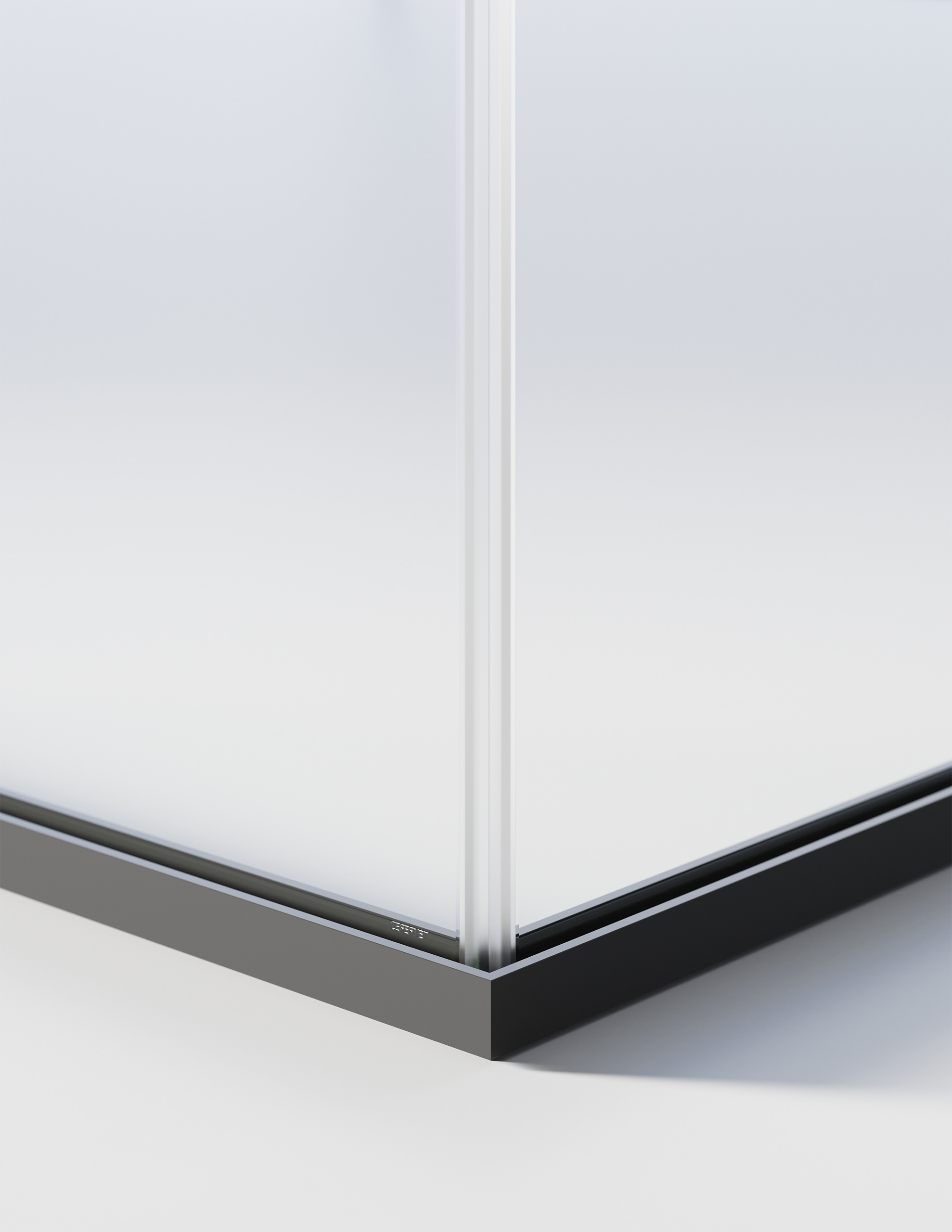 Single panel partition that accommodates 10/11 or 12/13 mm free-standing sheets. The 40 mm glazing bead profile allows excellent adjustment during levelling while maintaining and extremely contained visual impact. The vertical connections between glass modules are made of methacrylate or aluminium profiles.