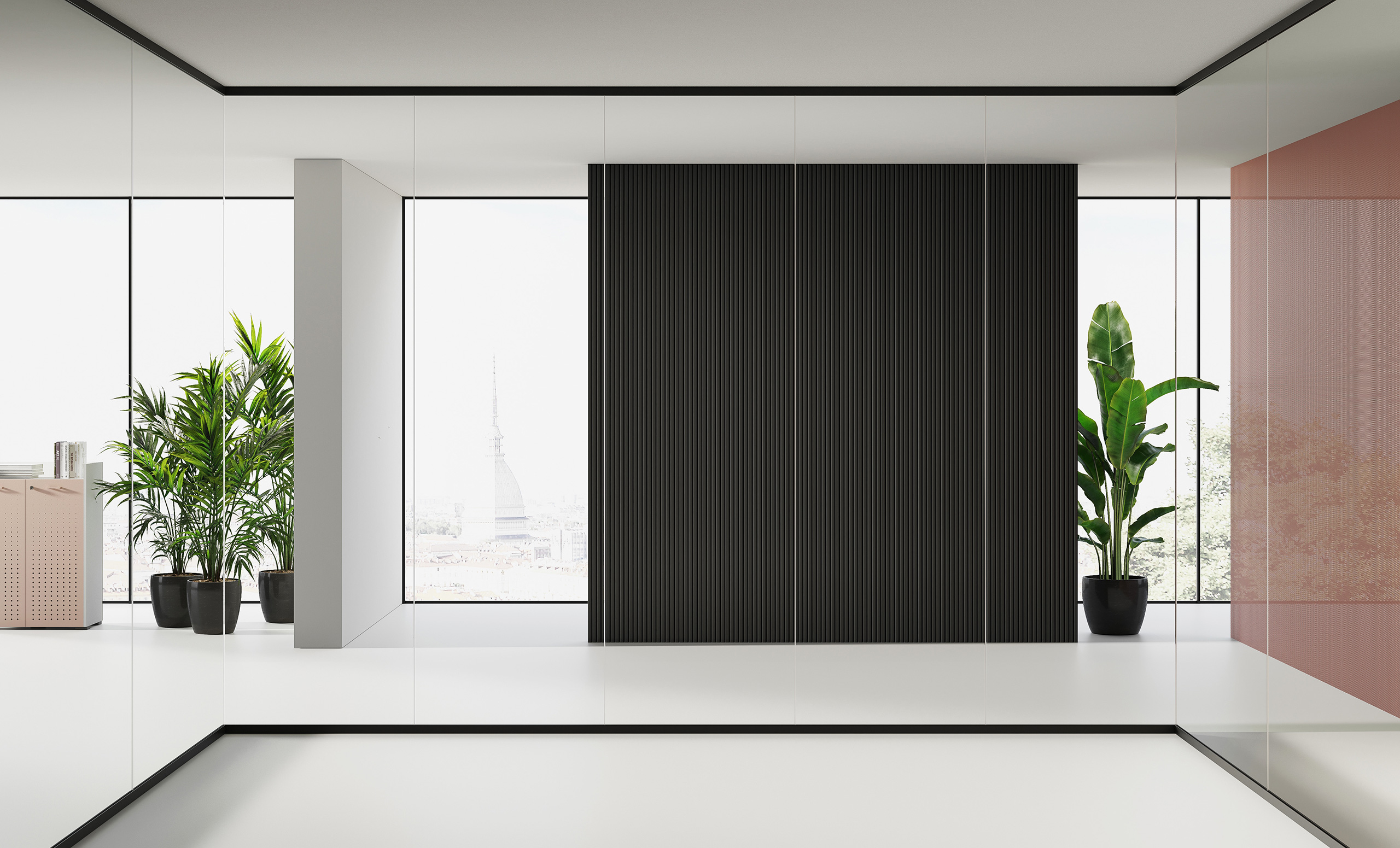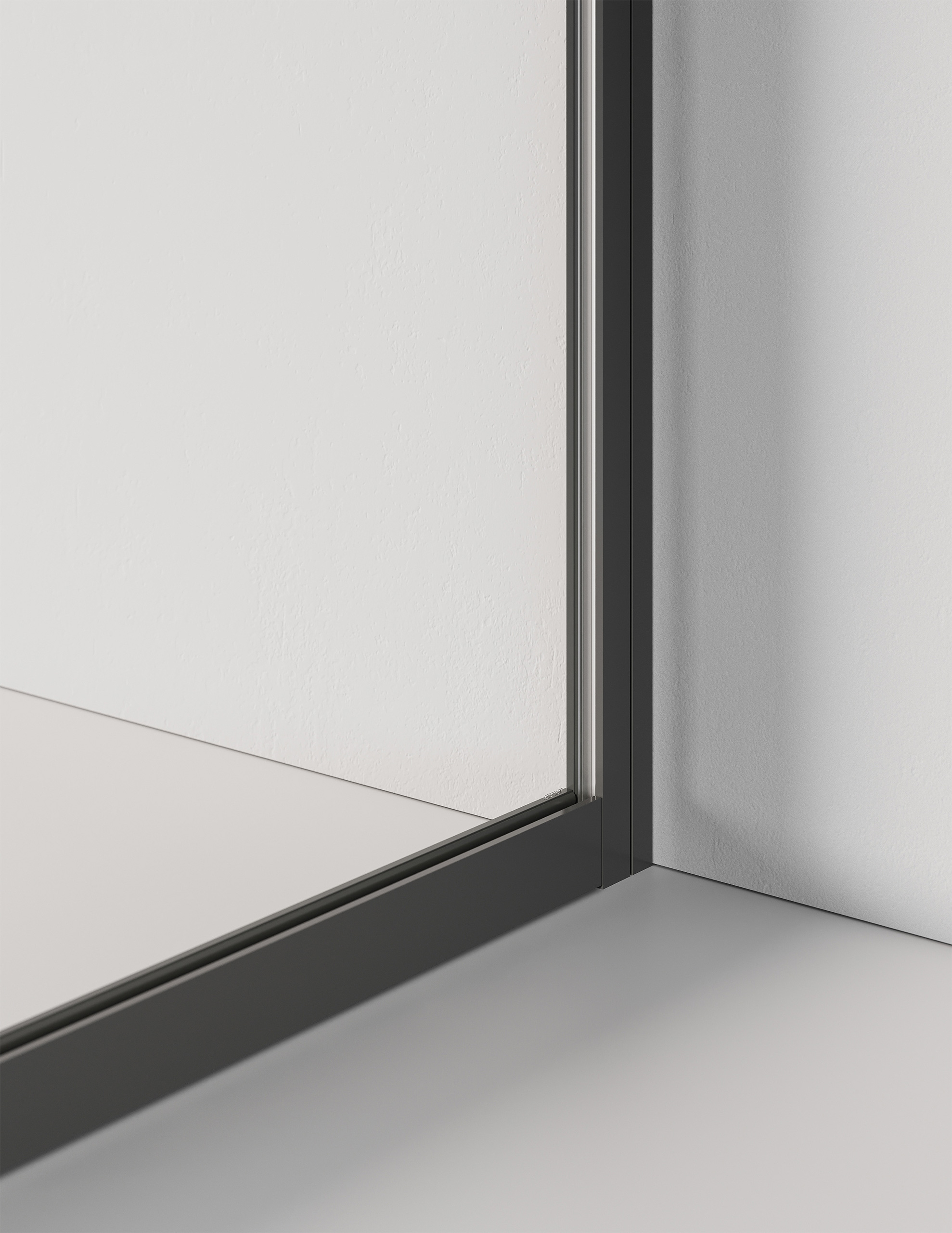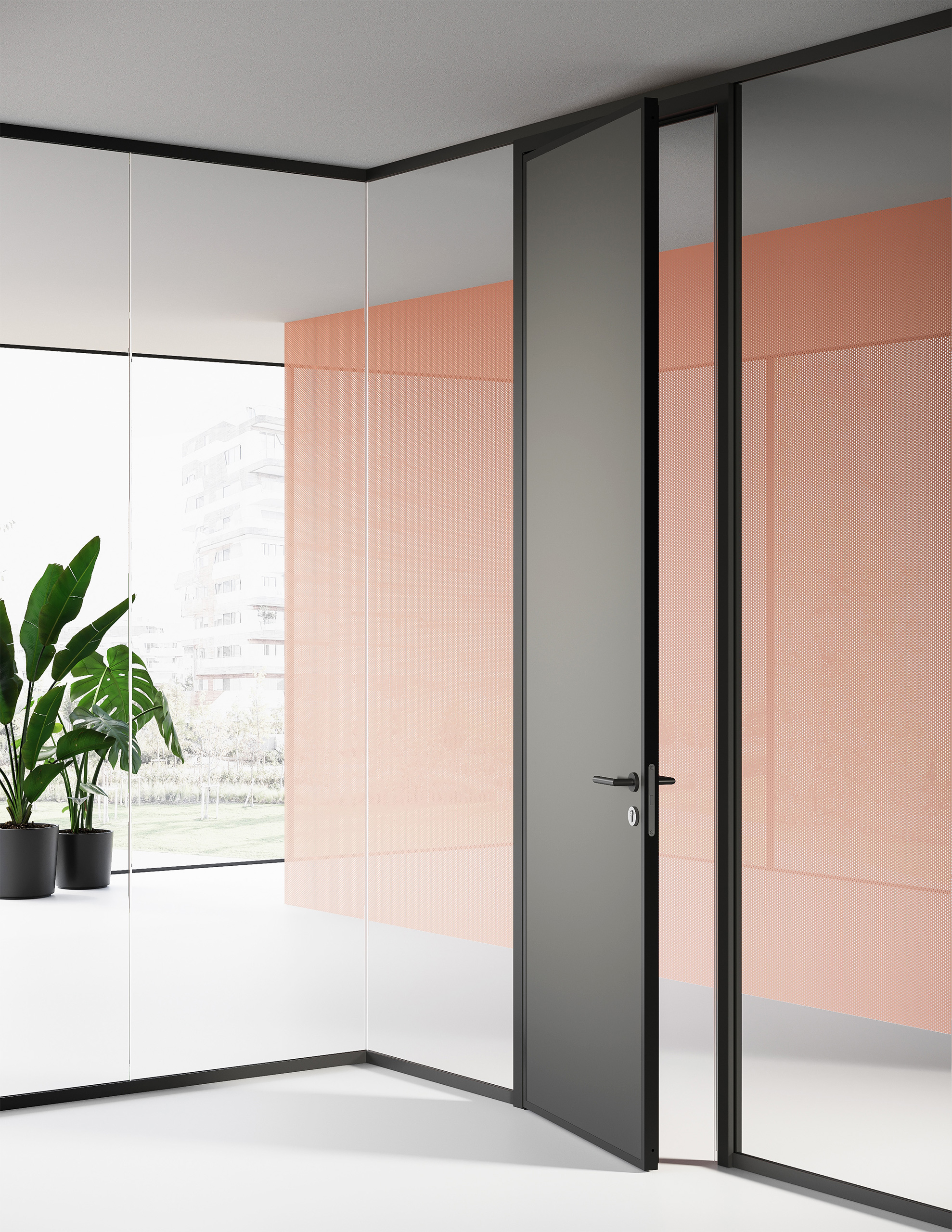 Single panel partition that accommodates 10/11 or 12/13 mm free-standing sheets. The 40 mm glazing bead profile allows excellent adjustment during levelling while maintaining and extremely contained visual impact. The vertical connections between glass modules are made of methacrylate or aluminium profiles.