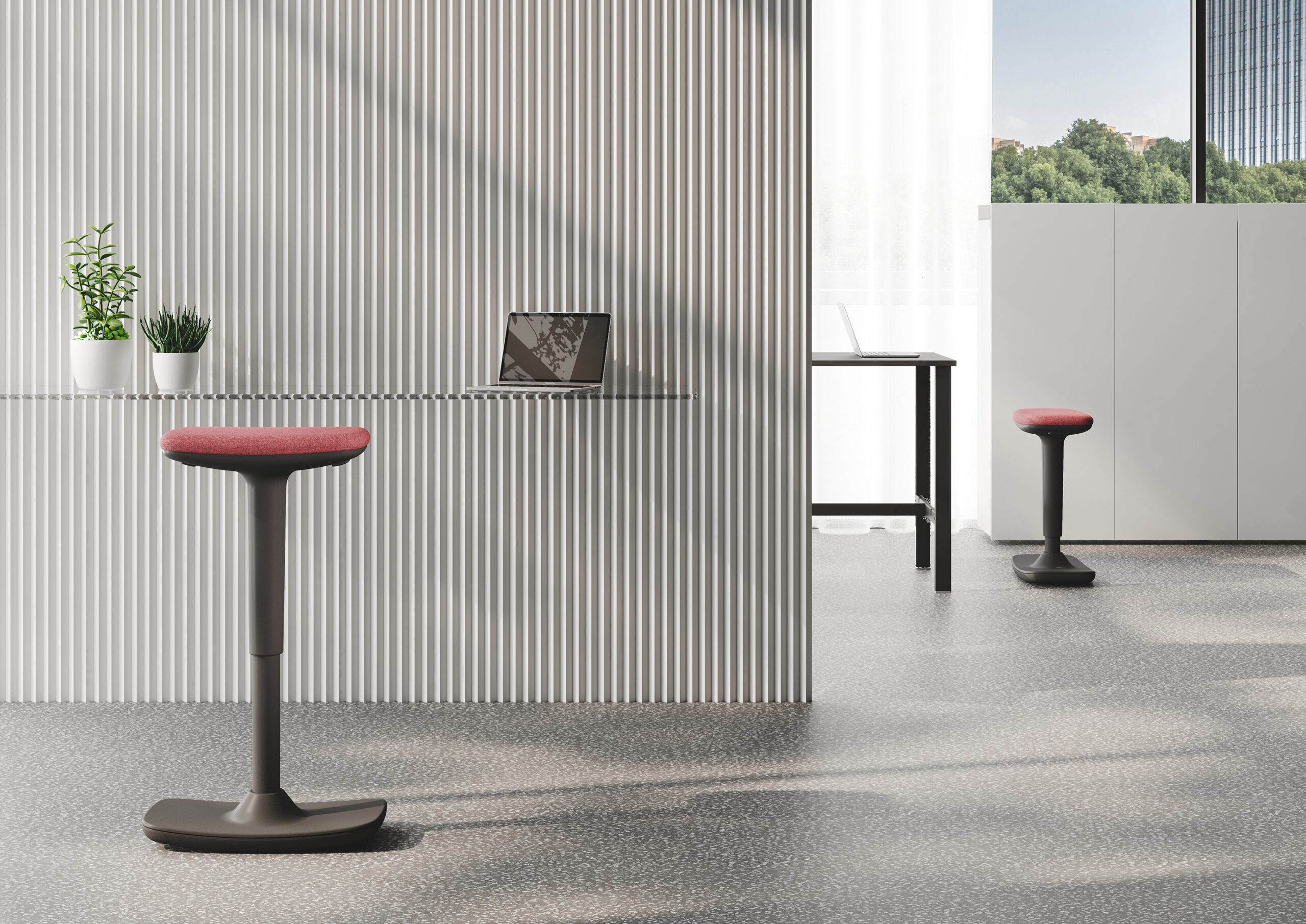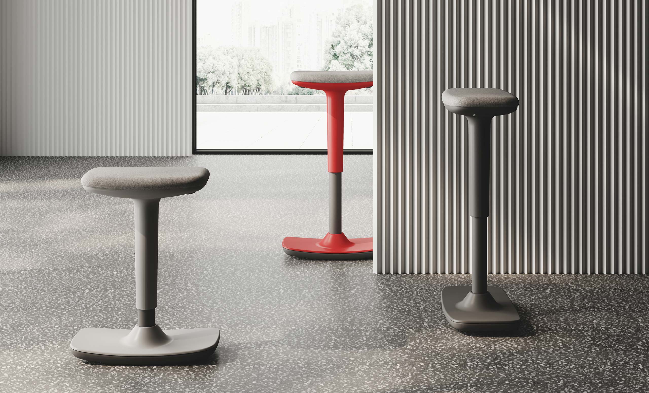 Elevation, rotation and oscillation are the movements of the seat that allow for an ever-changing use within innovative smart offices.