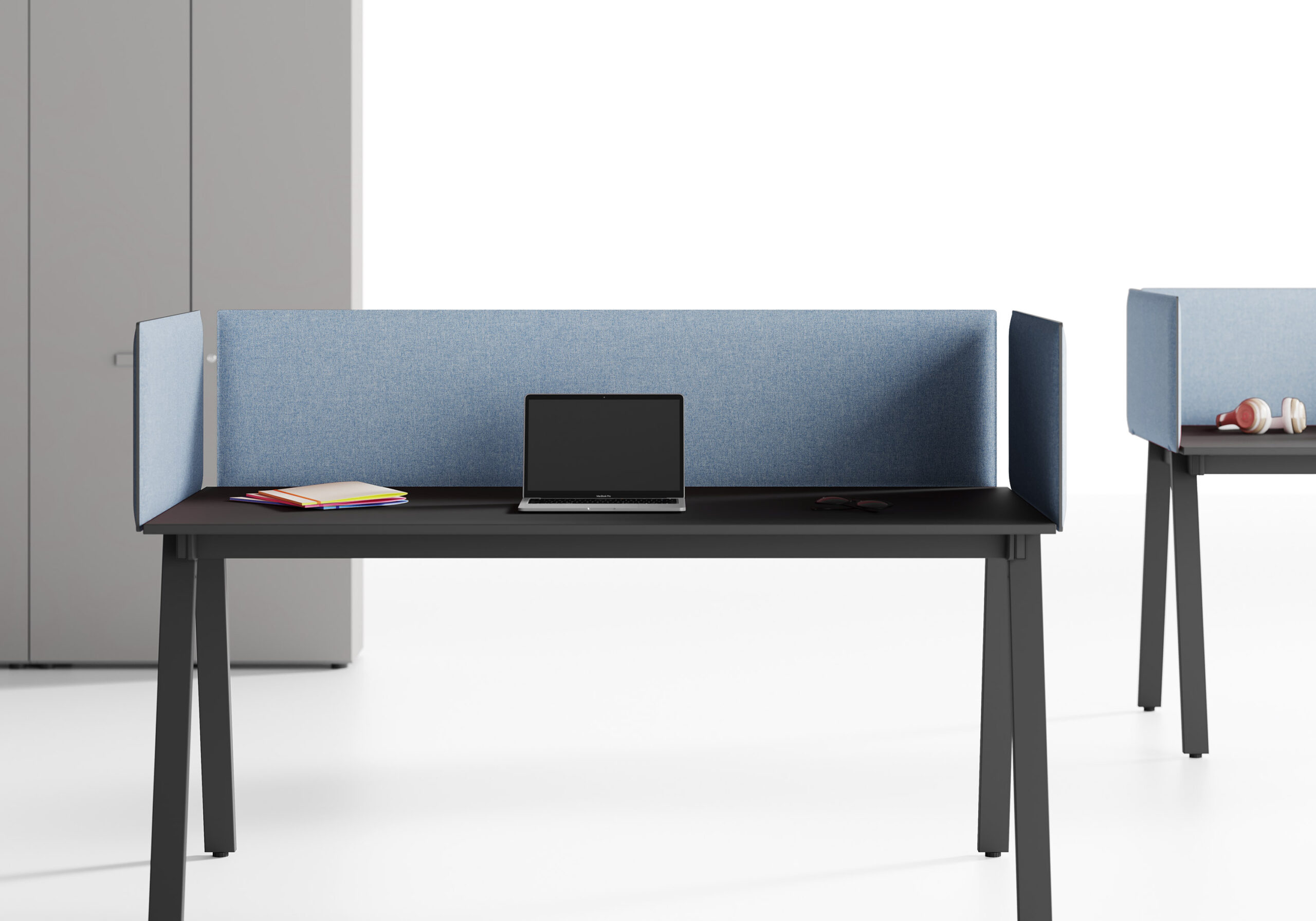 The need to keep the workstations separate or to improve their acoustic comfort require a new way to introduce partition panels, making them adaptable to any collection without limitations. This means that you can choose the type of screen that meets your needs best, simple or acoustic partitions, enrich it with your favourite accessories and customise your workstation. The concept of horizontal applicability of the partition screens, available in 5 different versions, is possible through the concealed fixing system under the top, which adds an aesthetic element and technical improvement.