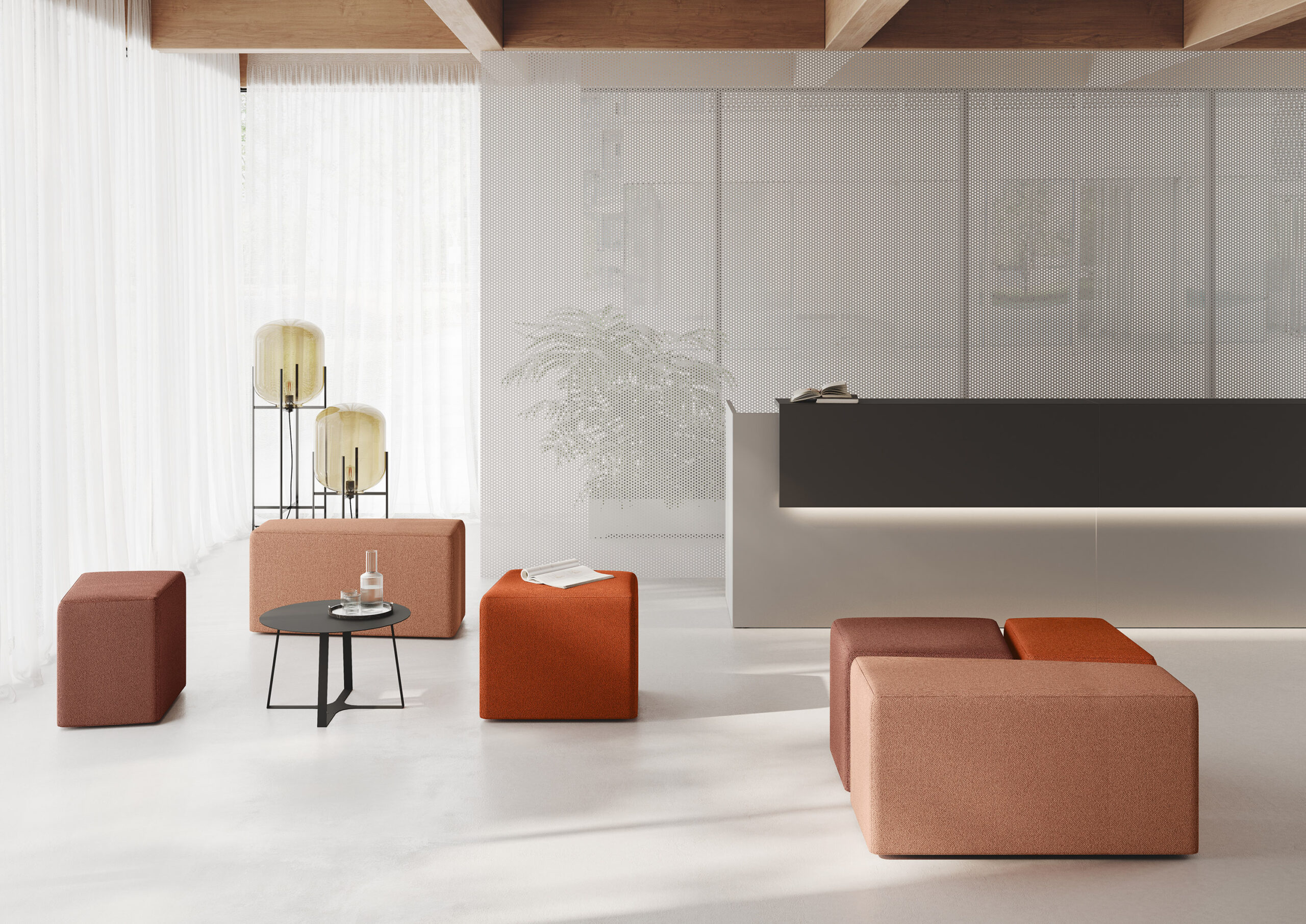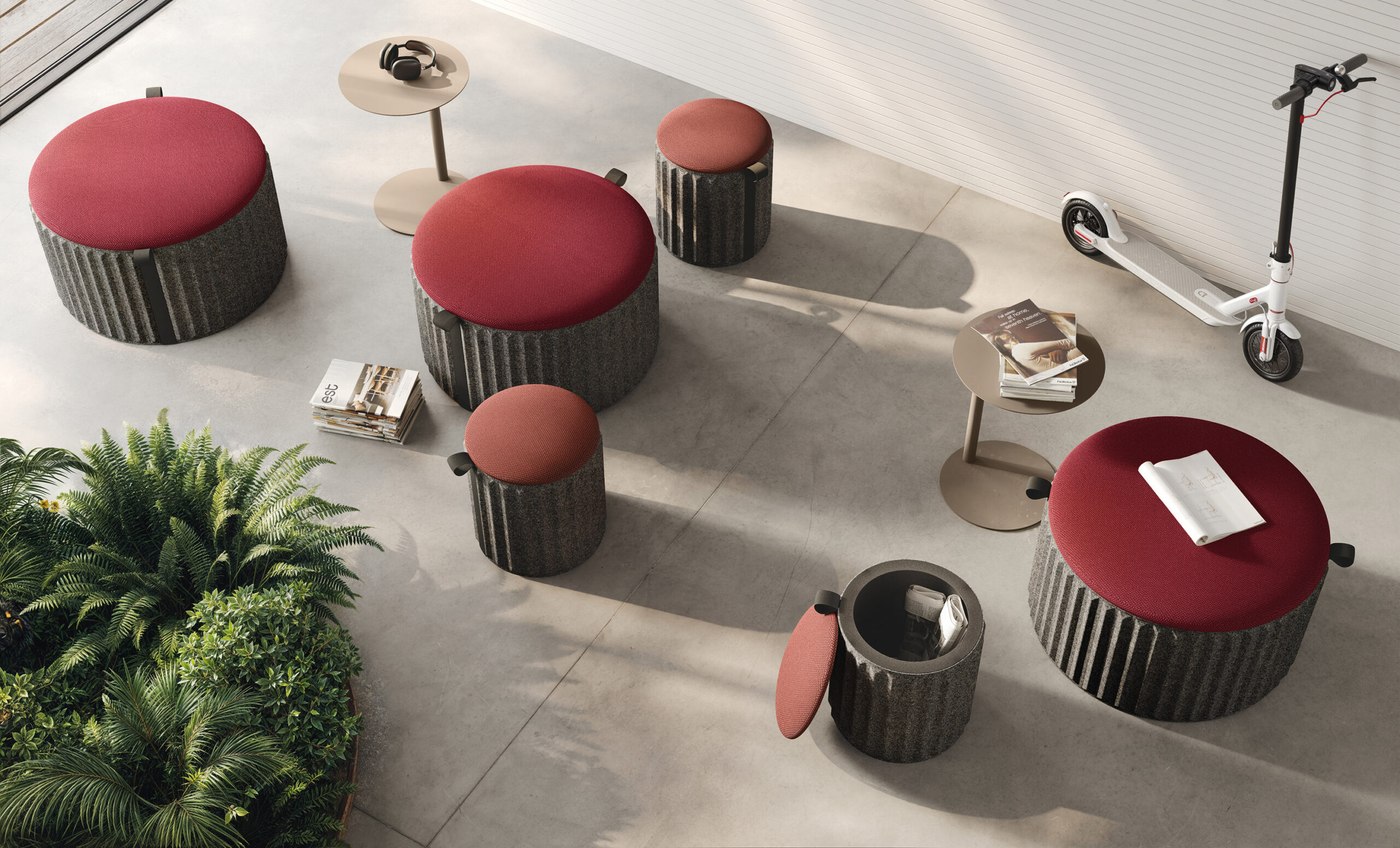 Des assises modulaires, simples et combinables à volonté, fonctionnelles ou simplement scéniques, conçues pour caractériser les espaces d’accueil, de détente ou de travail en groupe, ou simplement insérées dans l’environnement en tant qu’éléments de style ou de repère avec une infinité de couleurs.