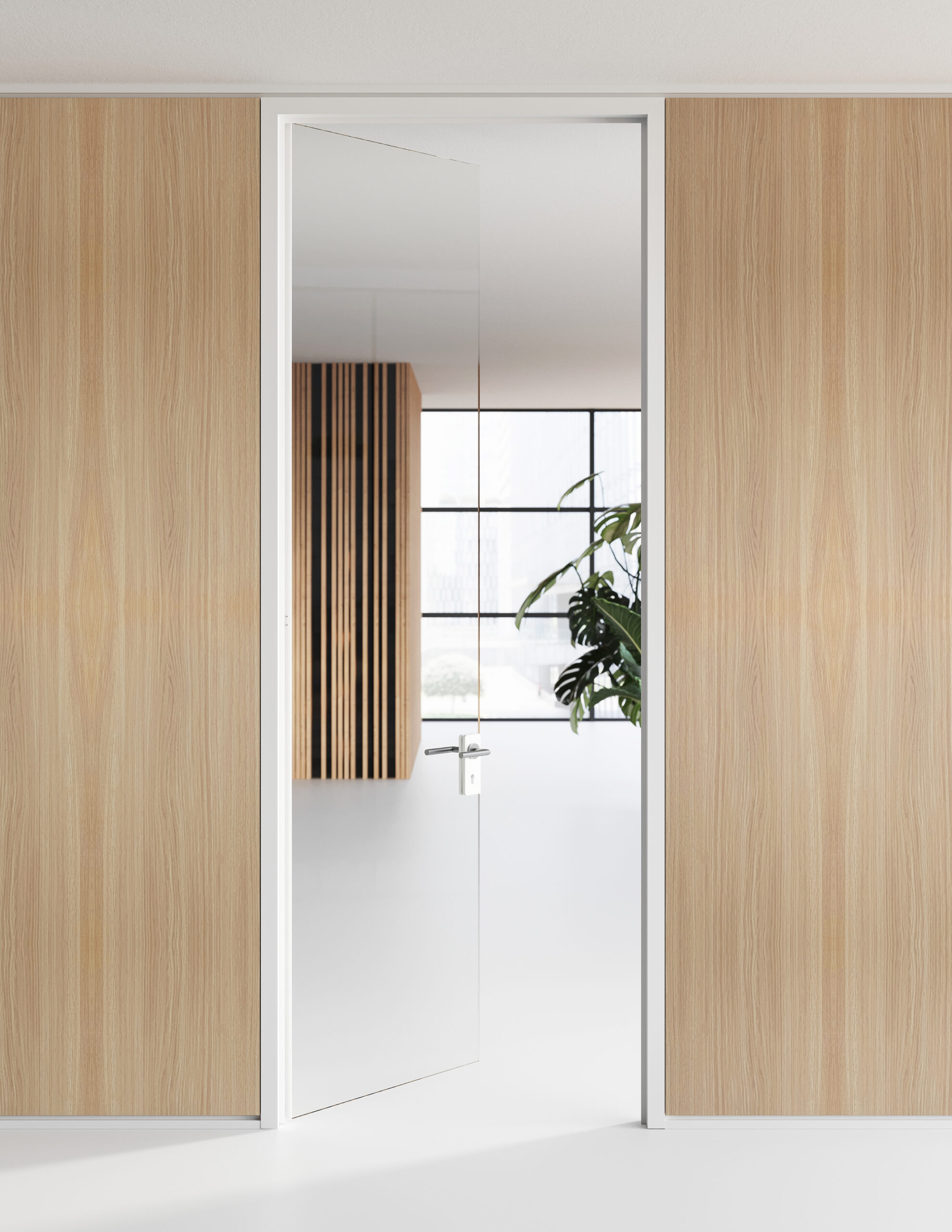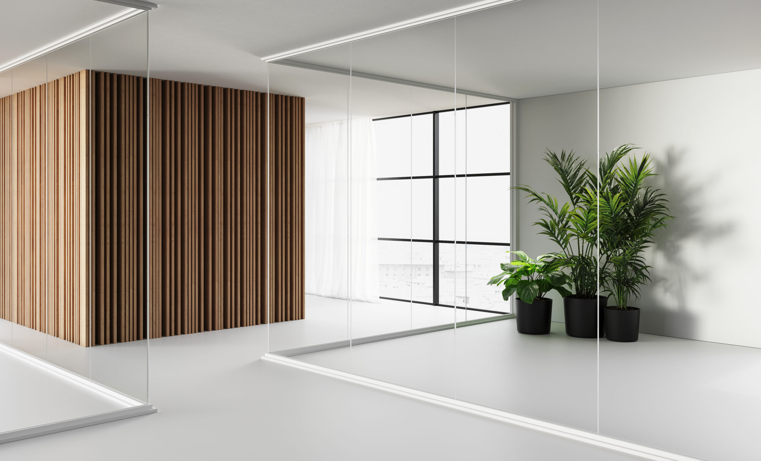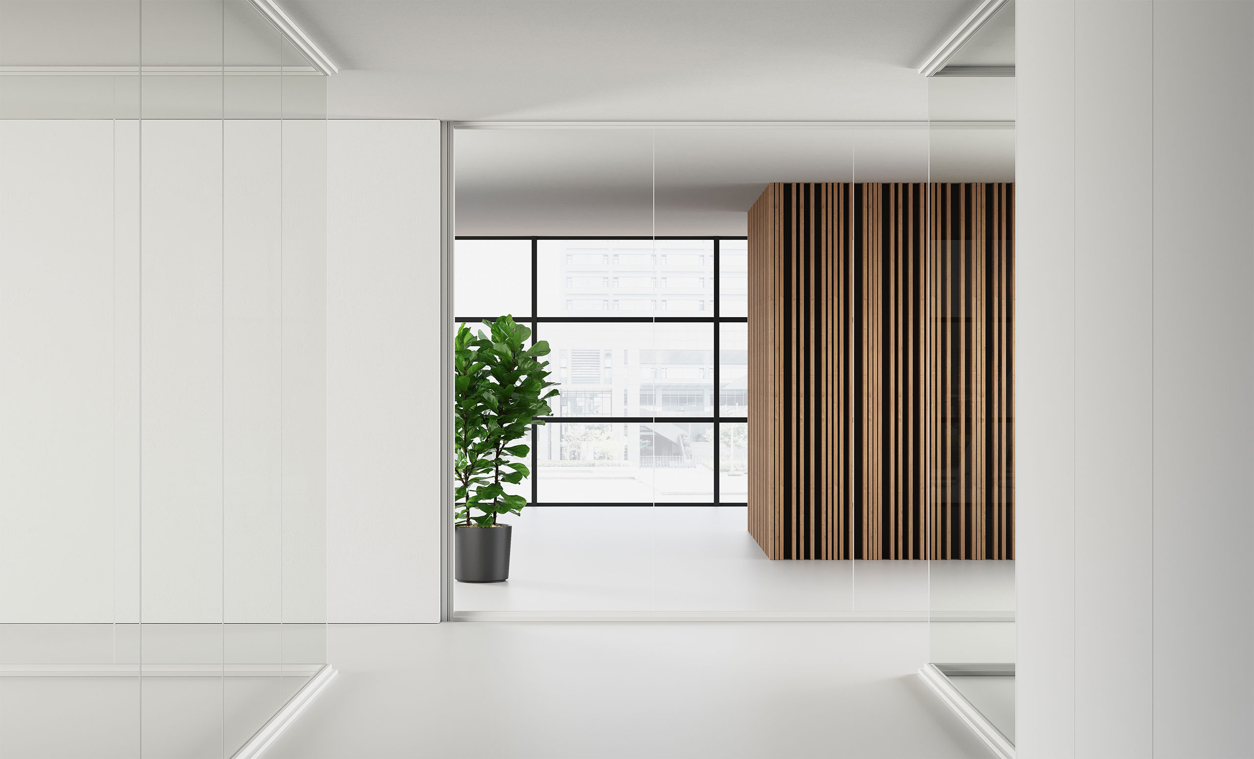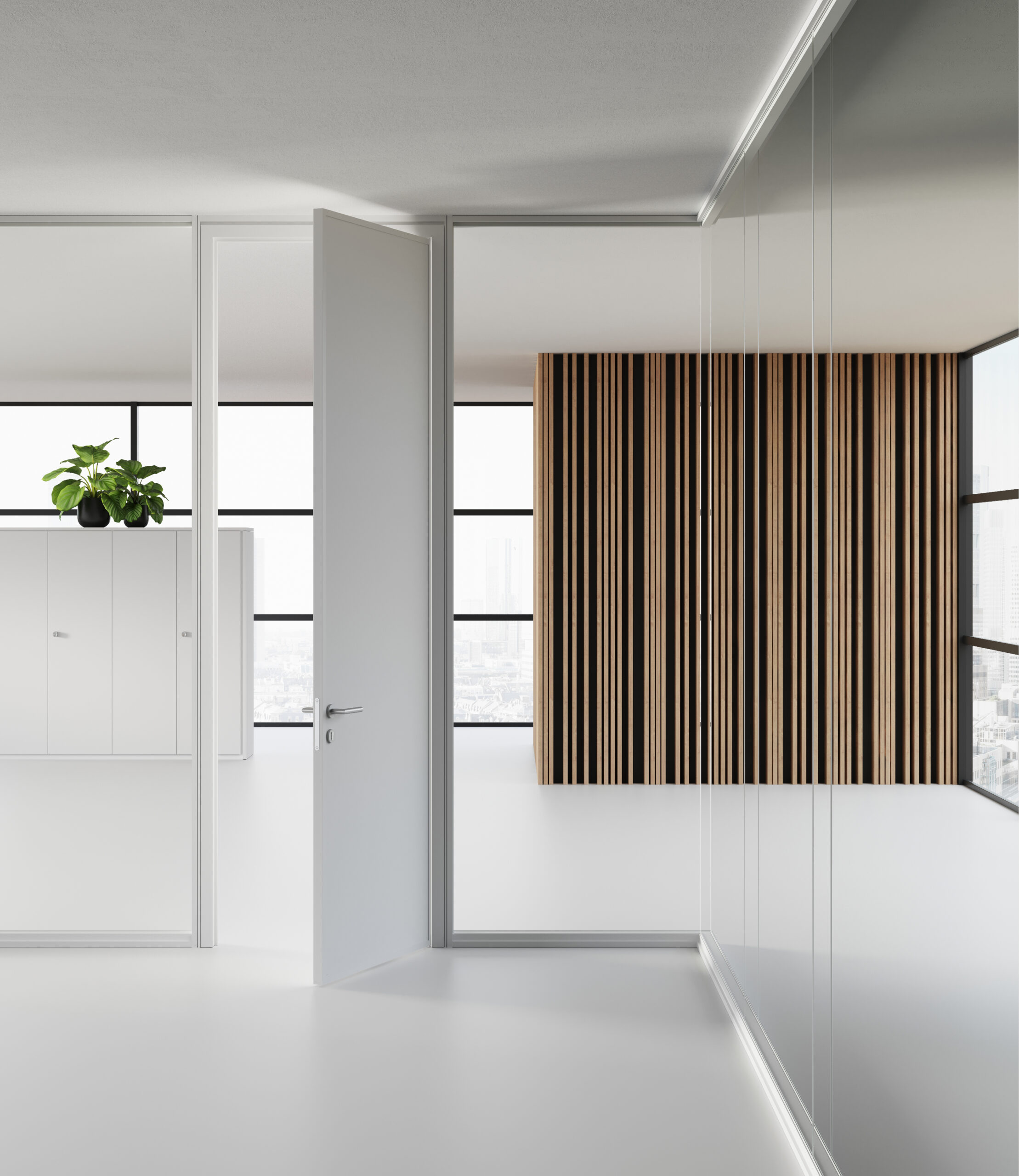 Une cloison à double-vitrage autoportant aux performances sonores remarquables. Elle naît de la volonté conceptuelle de créer des pièces apparemment sans masse mais en mesure de garantir des valeurs de réduction des bruits à la hauteur des plus grandes attentes. Une excellente barrière invisible pour ne pas entendre tout en observant