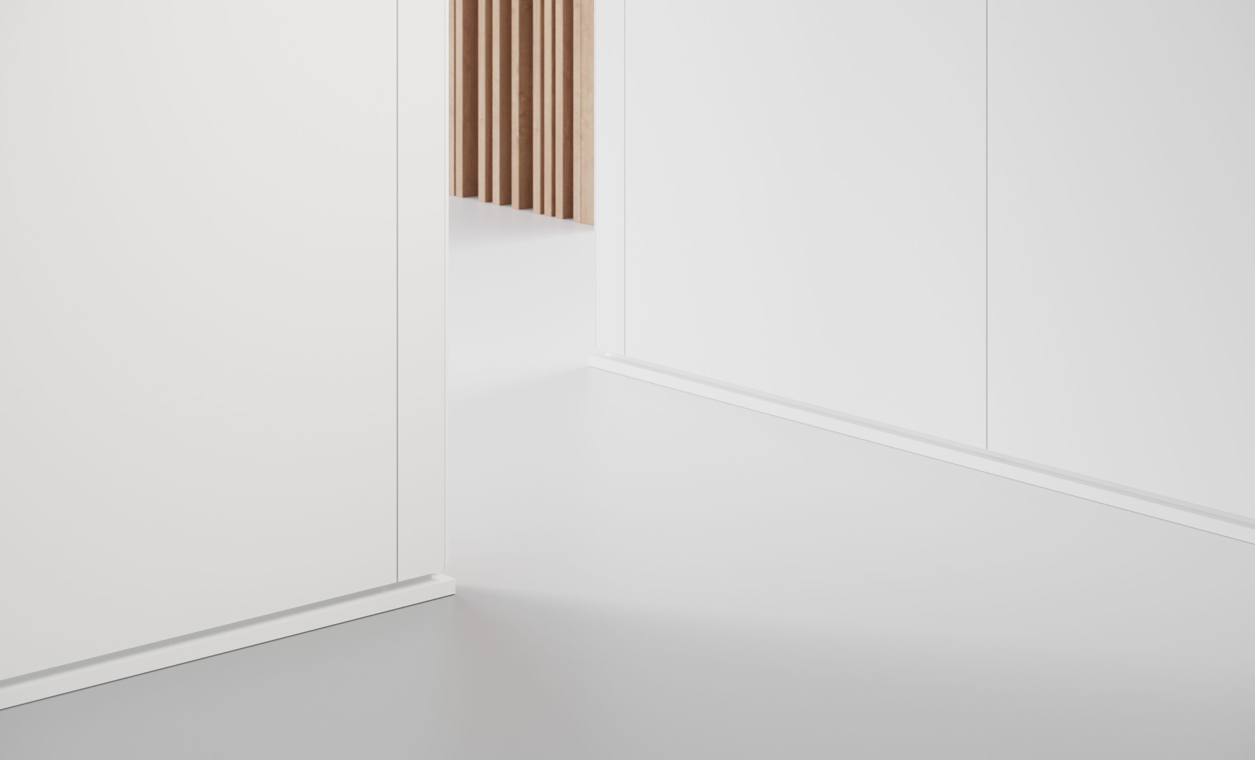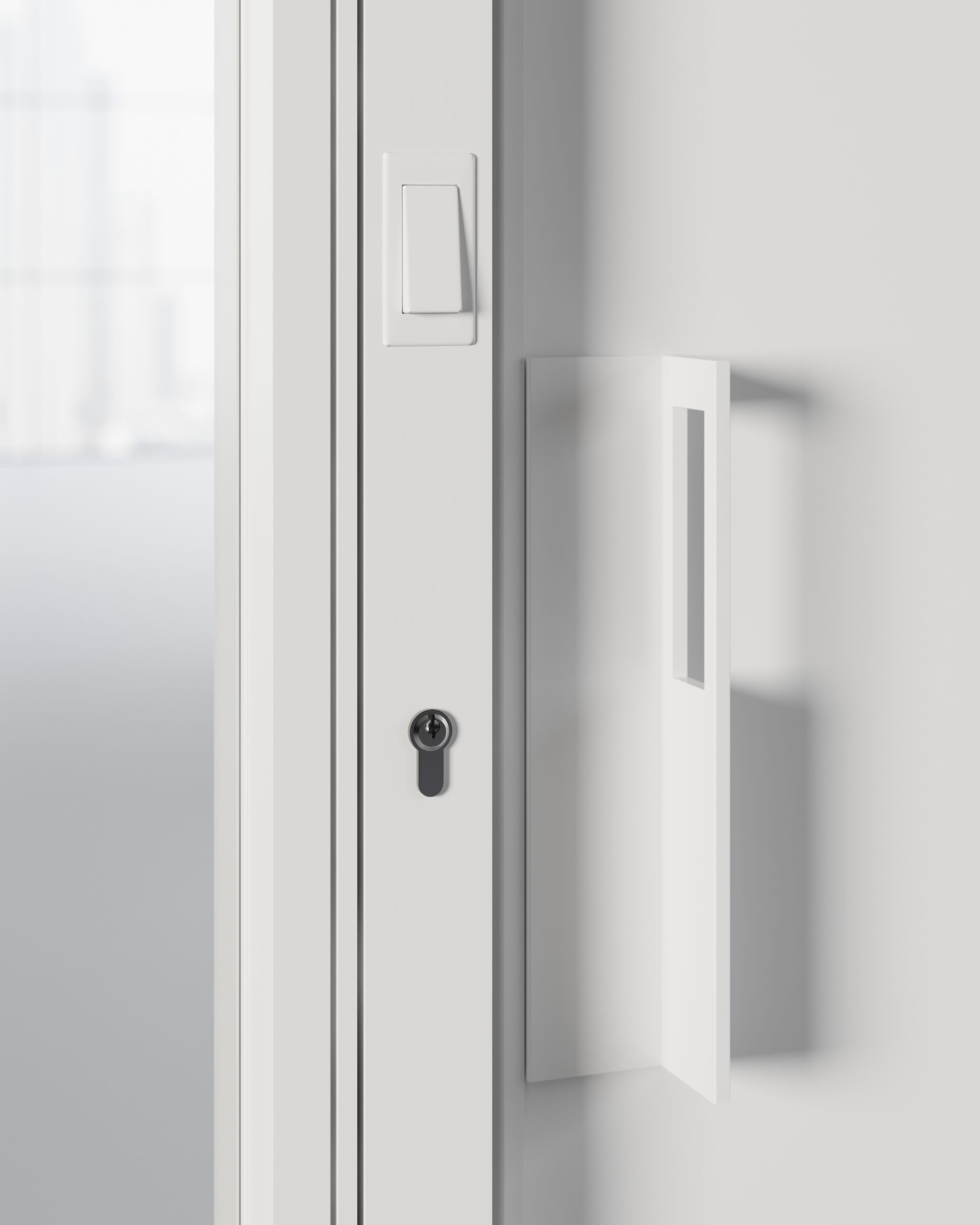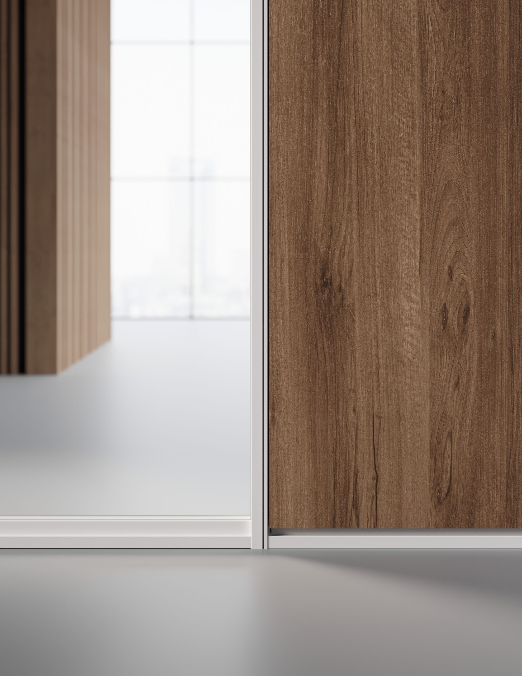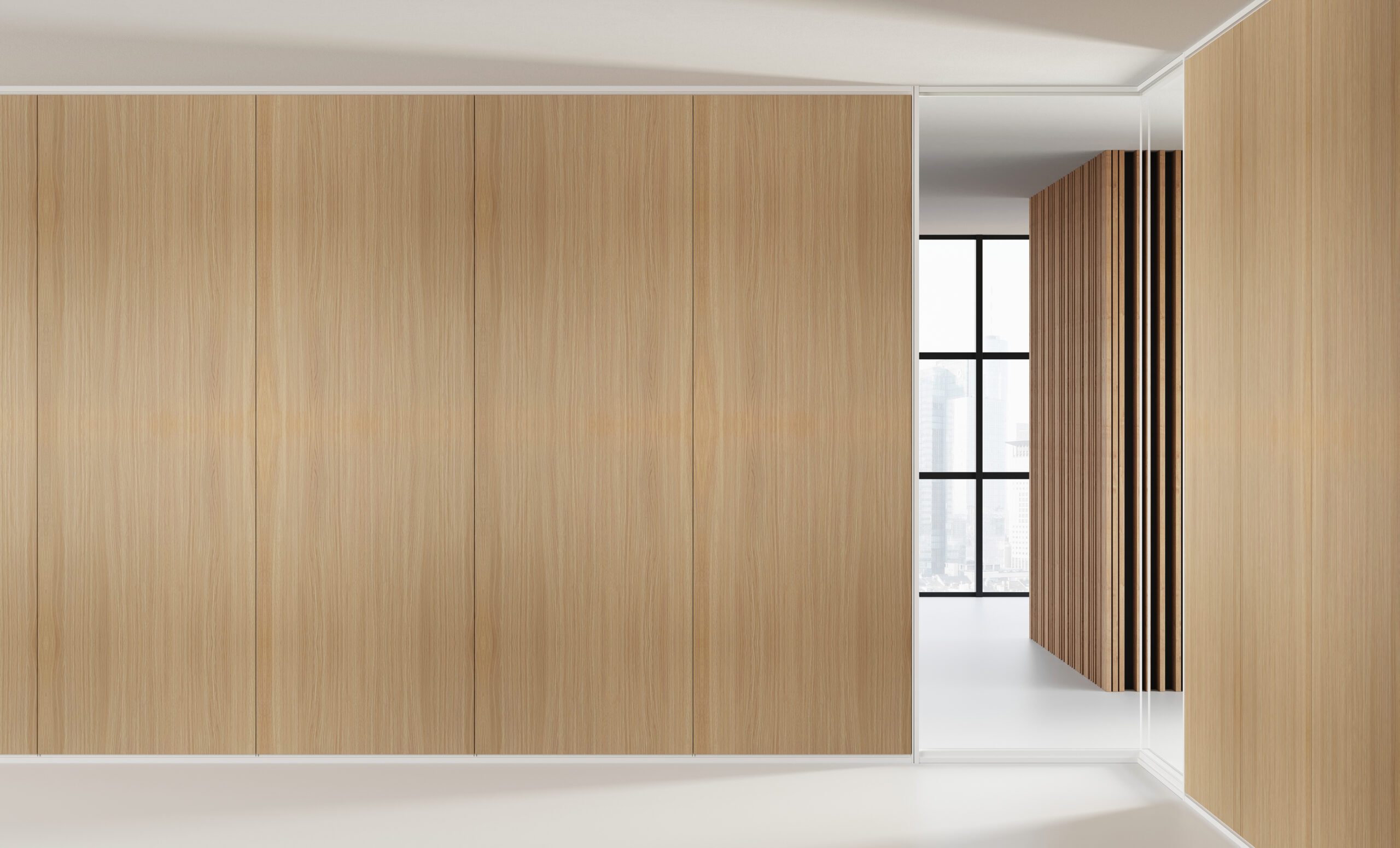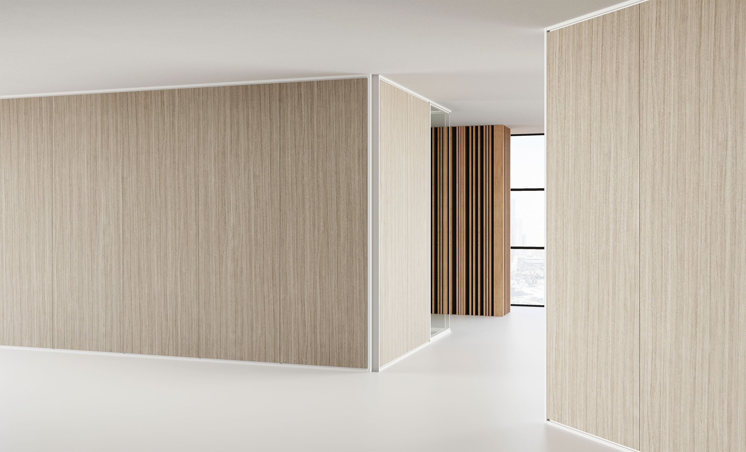 Une cloison-placards avec panneaux de séparation en bois équipée de montants structurels en acier galvanisés. Elle complète la collection avec une autre approche de matières. À la transparence elle oppose l’opacité, à la froideur la chaleur du bois en différentes finitions et couleurs. Technique, câblage disponible et facilement contrôlable.