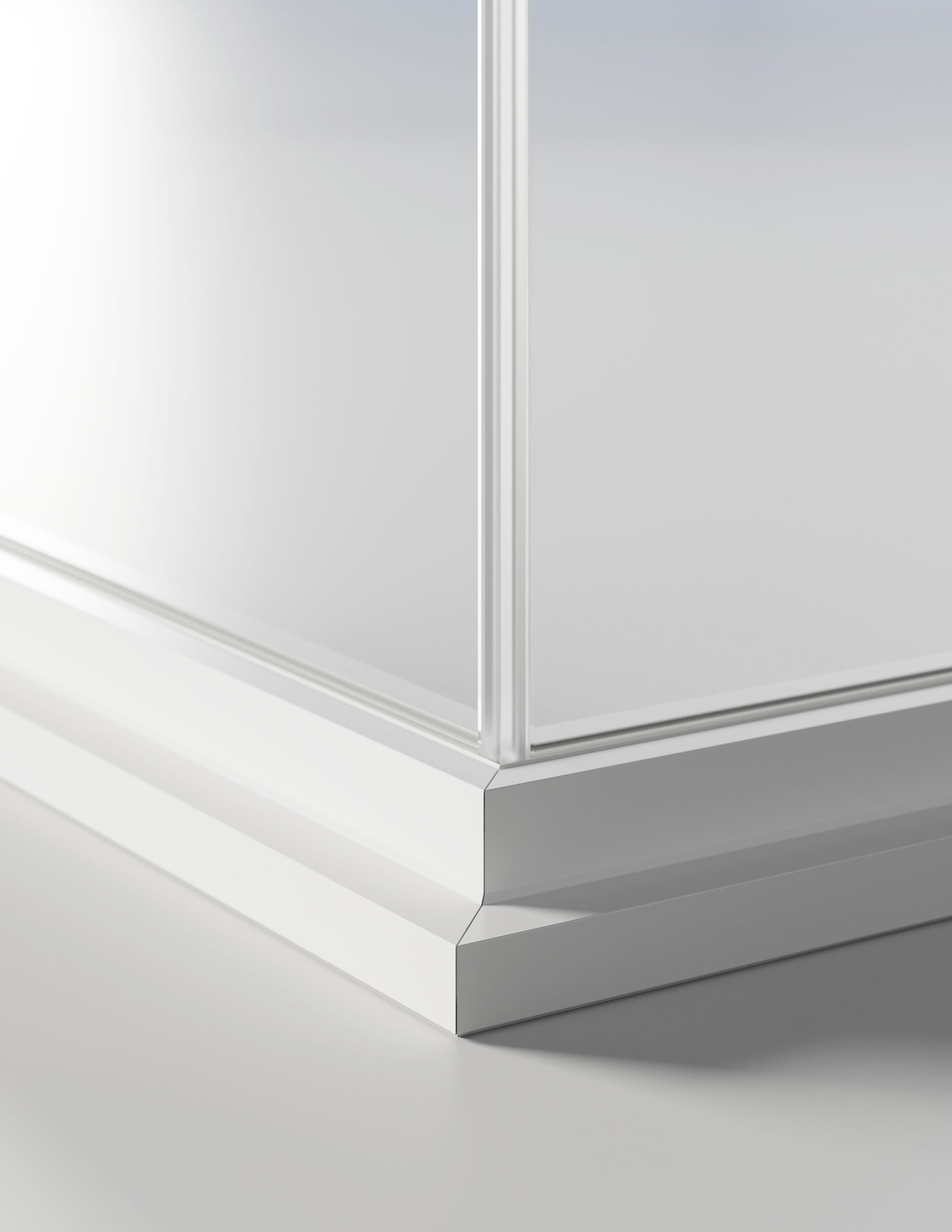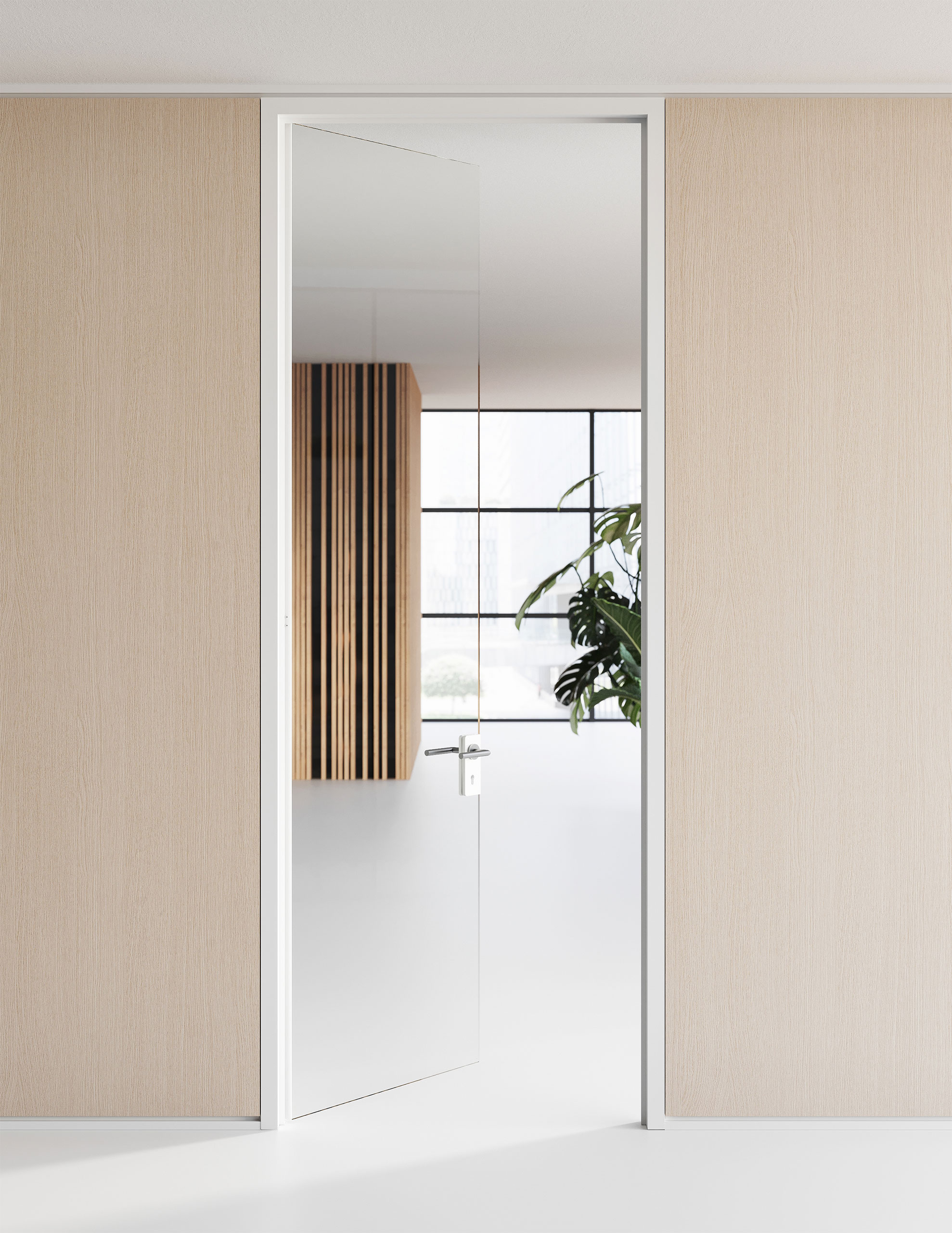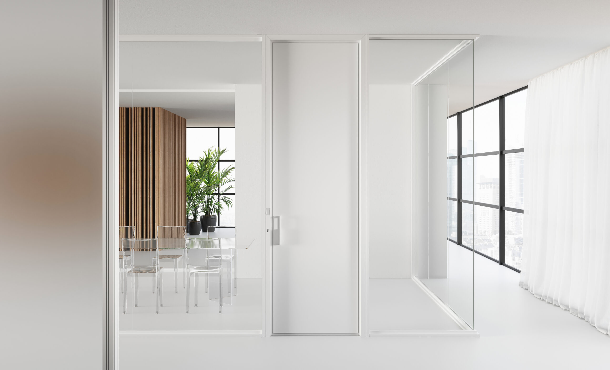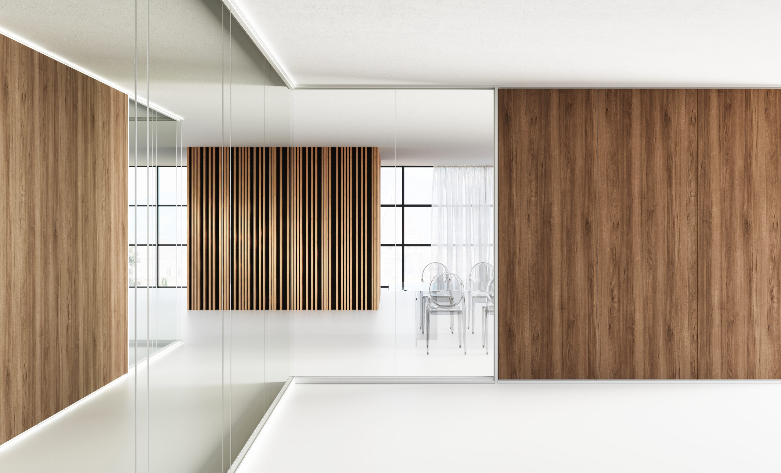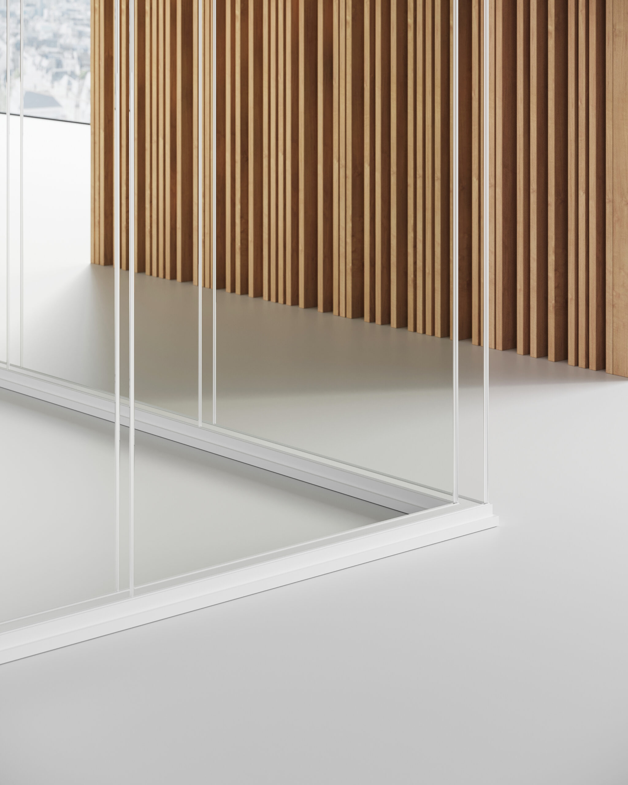 Il s’agit d’une cloison de séparation de 100 mm d’épaisseur caractérisée par l’emploi de panneaux autoportants en verre. Un autre type qui, grâce à l’élimination des montants structurels, vise à unir les opposés à la recherche d’un idéal de robustesse et de transparence parfaite tout en ayant des profils inférieur et supérieur amples et articulés.
