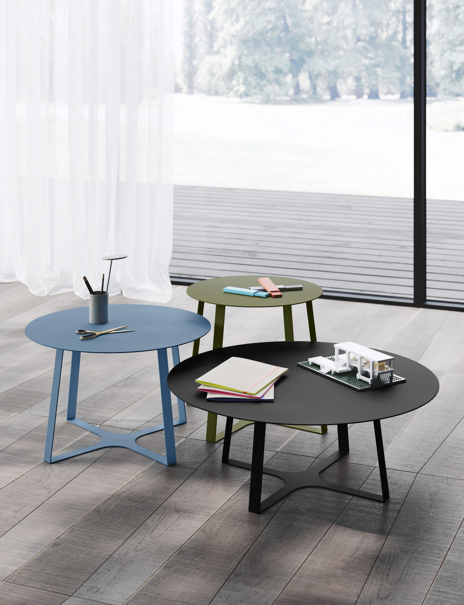 Une base en forme de croix qui s’ouvre pour devenir un support pour le plateau. Une solution composée en trois hauteurs de structure et trois tailles de plateau. Entièrement en métal et disponible dans les dix coloris prévus.
