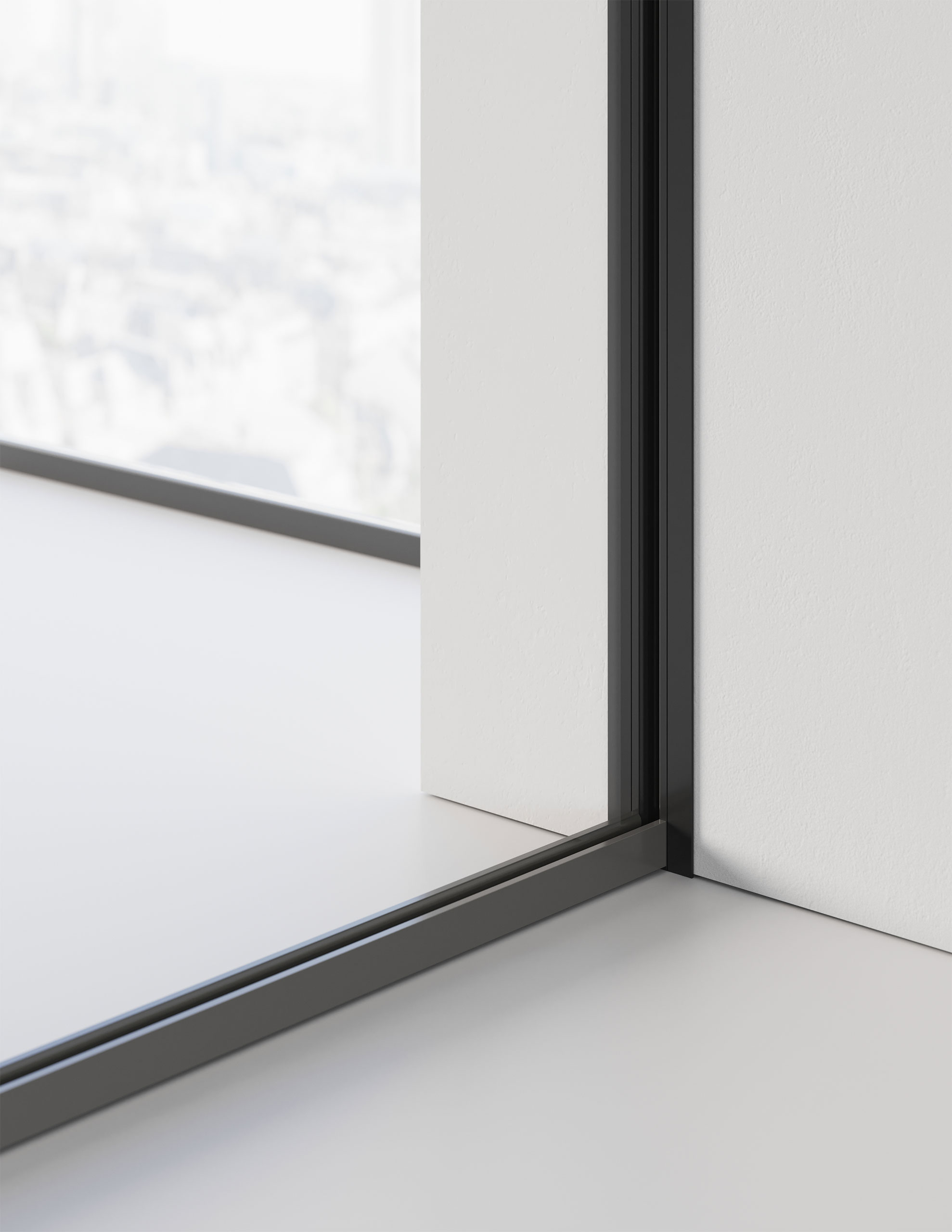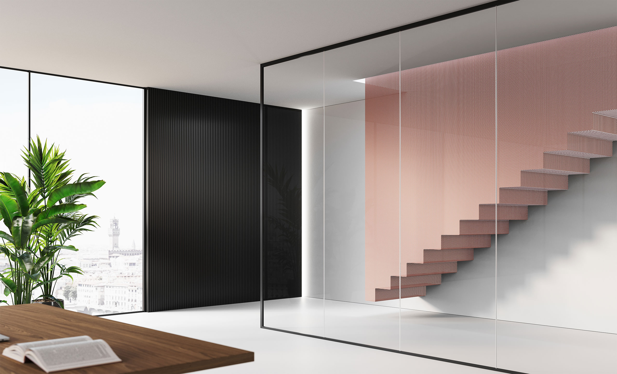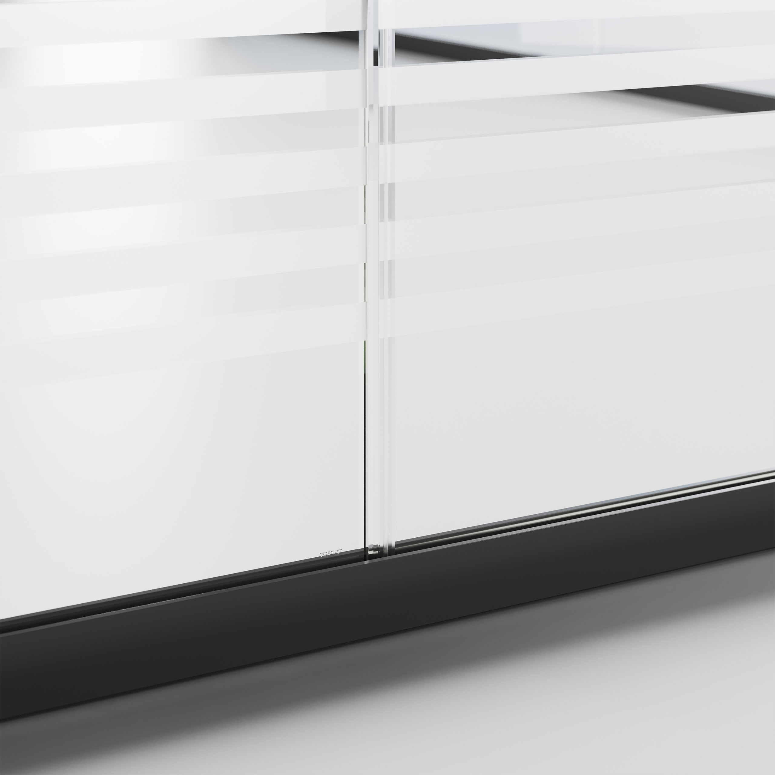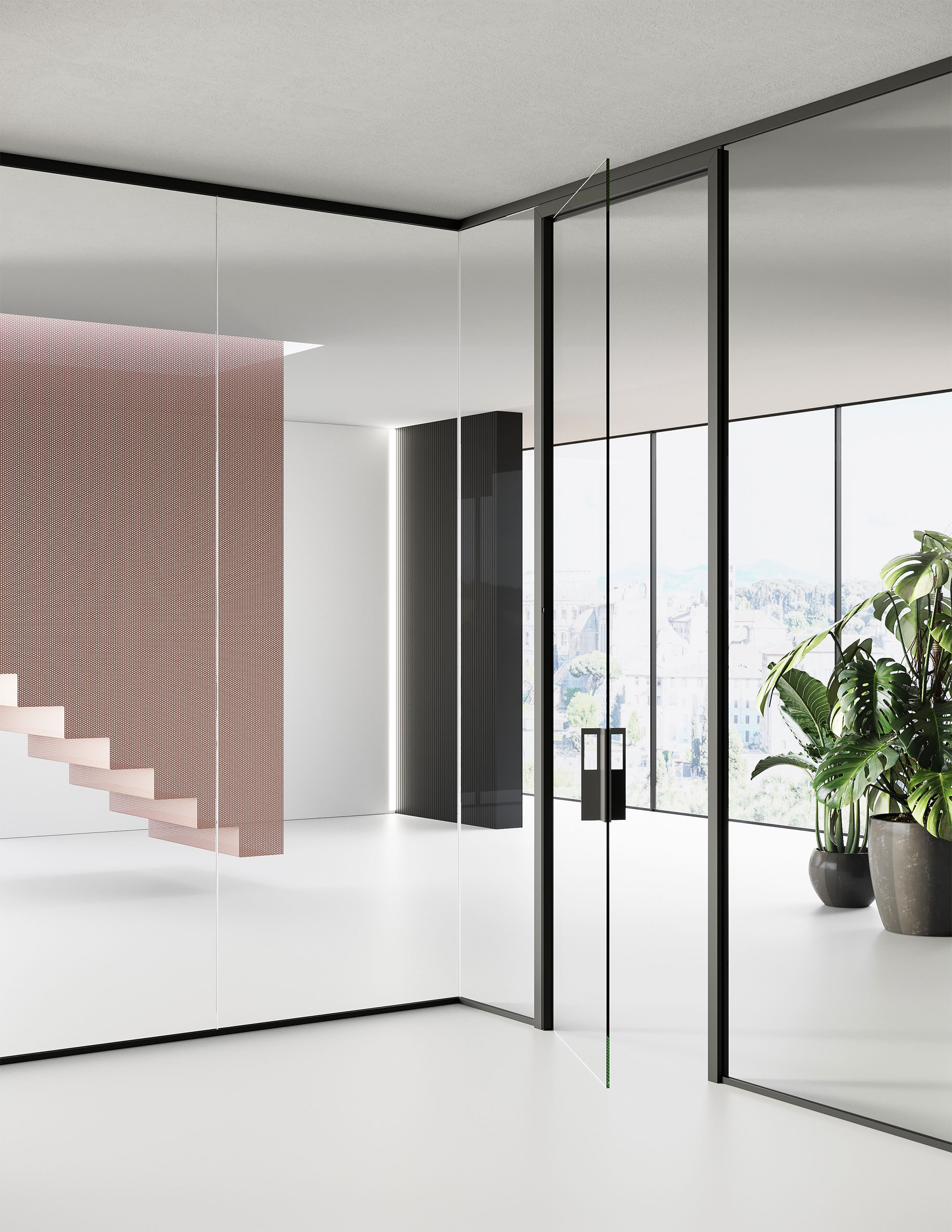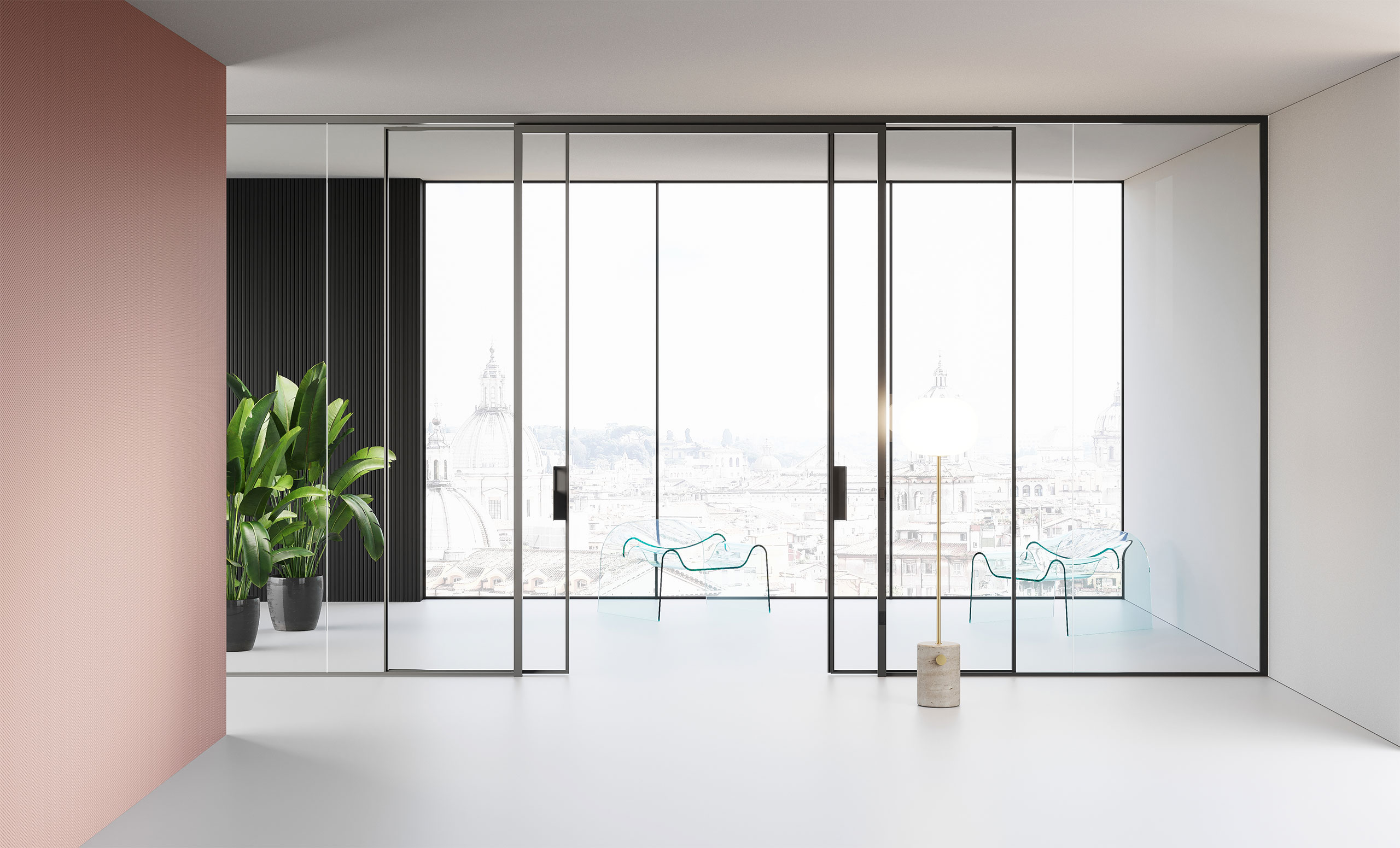 Une cloison de séparation mono-vitre autoportante de 10/11 ou 12/13 mm née dans le but de minimiser l’impact visuel des profils parclose inférieur et supérieur. Elle s’adapte parfaitement aux autres versions de Mood en exploitant tous les accessoires, les raccords entre les modules vitrés et les portes à vantail et coulissantes.