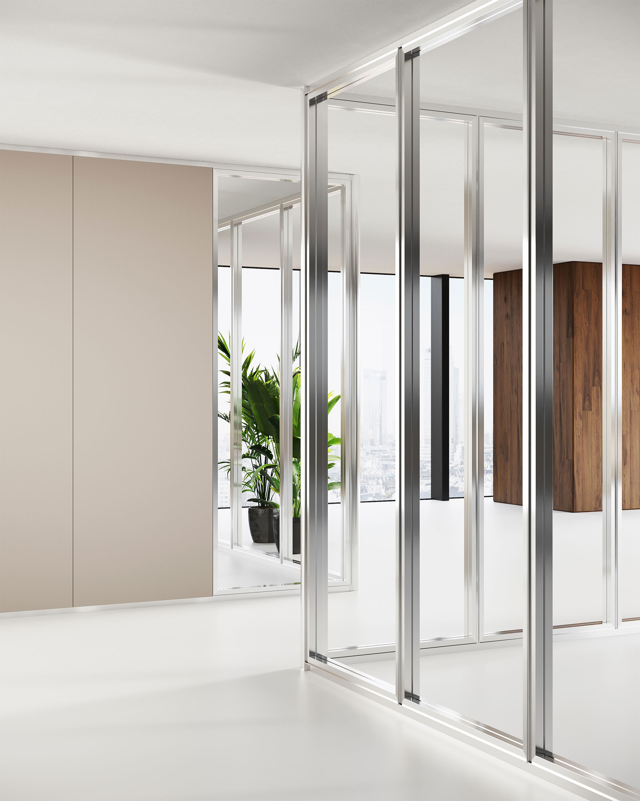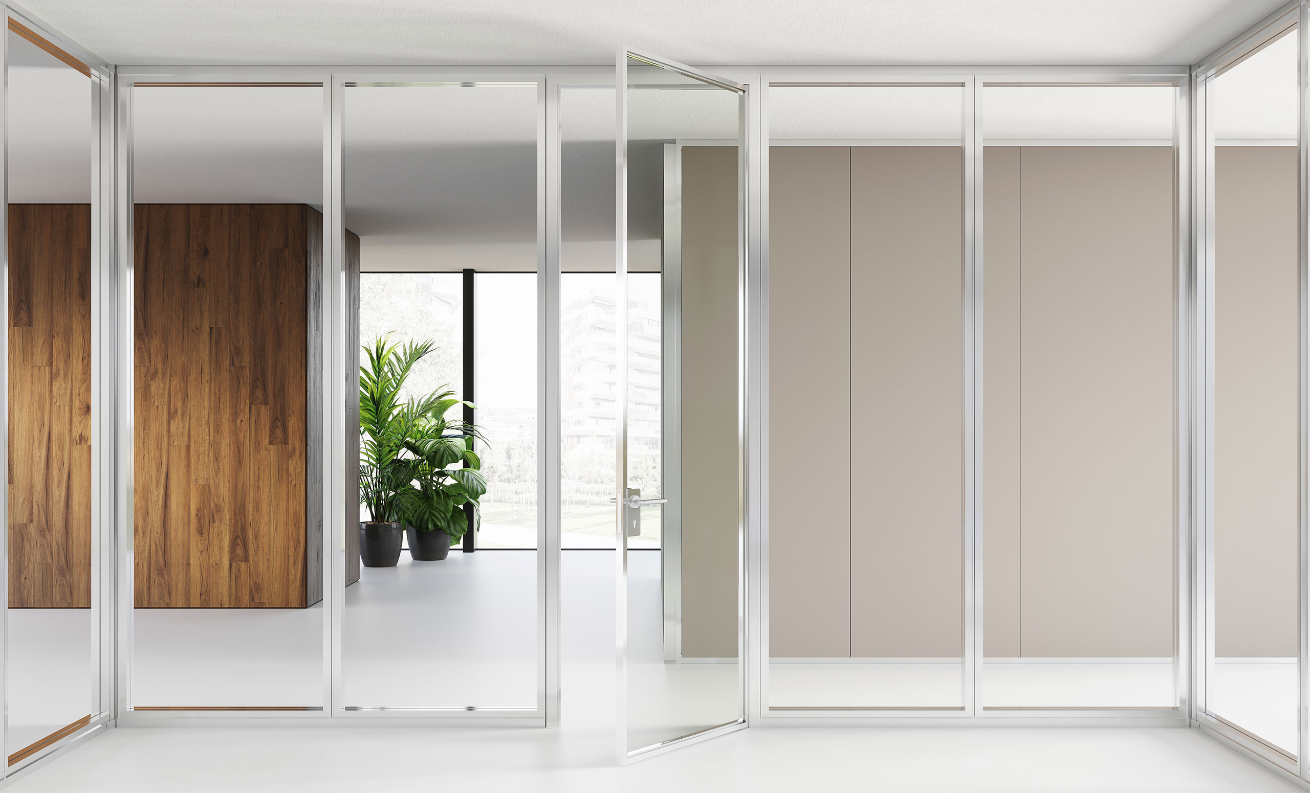 Un système modulaire de cloisons de séparation à placards caractérisé par des modules en bois ou en verre. Une séparation classique, avec une structure interne de montants et traverses en profilés d’acier galvanisé facilement ouvrable, câblage facile. Les éléments de raccord, les profilés angulaires et les intrados des portes sont réalisés en aluminium extrudé.
