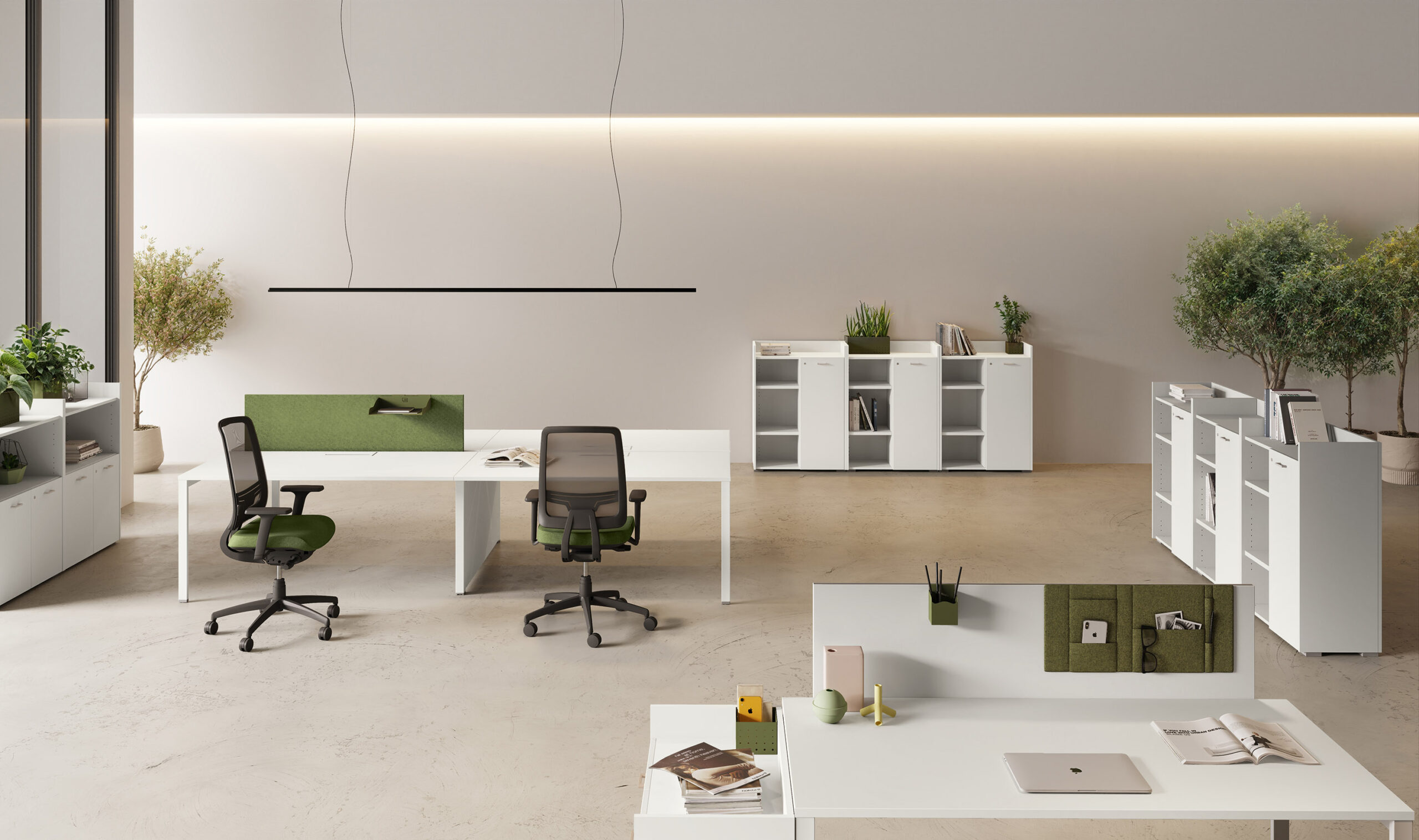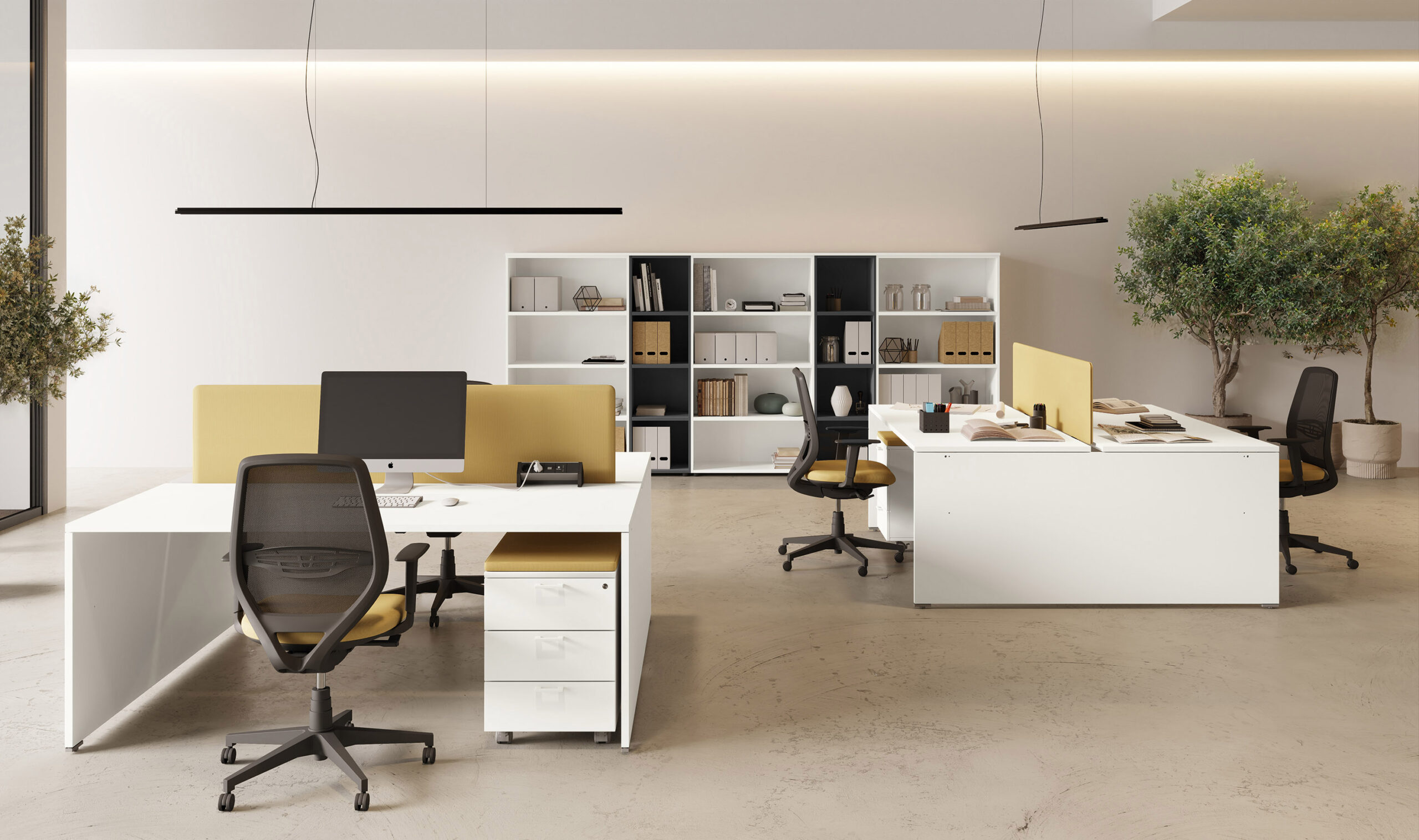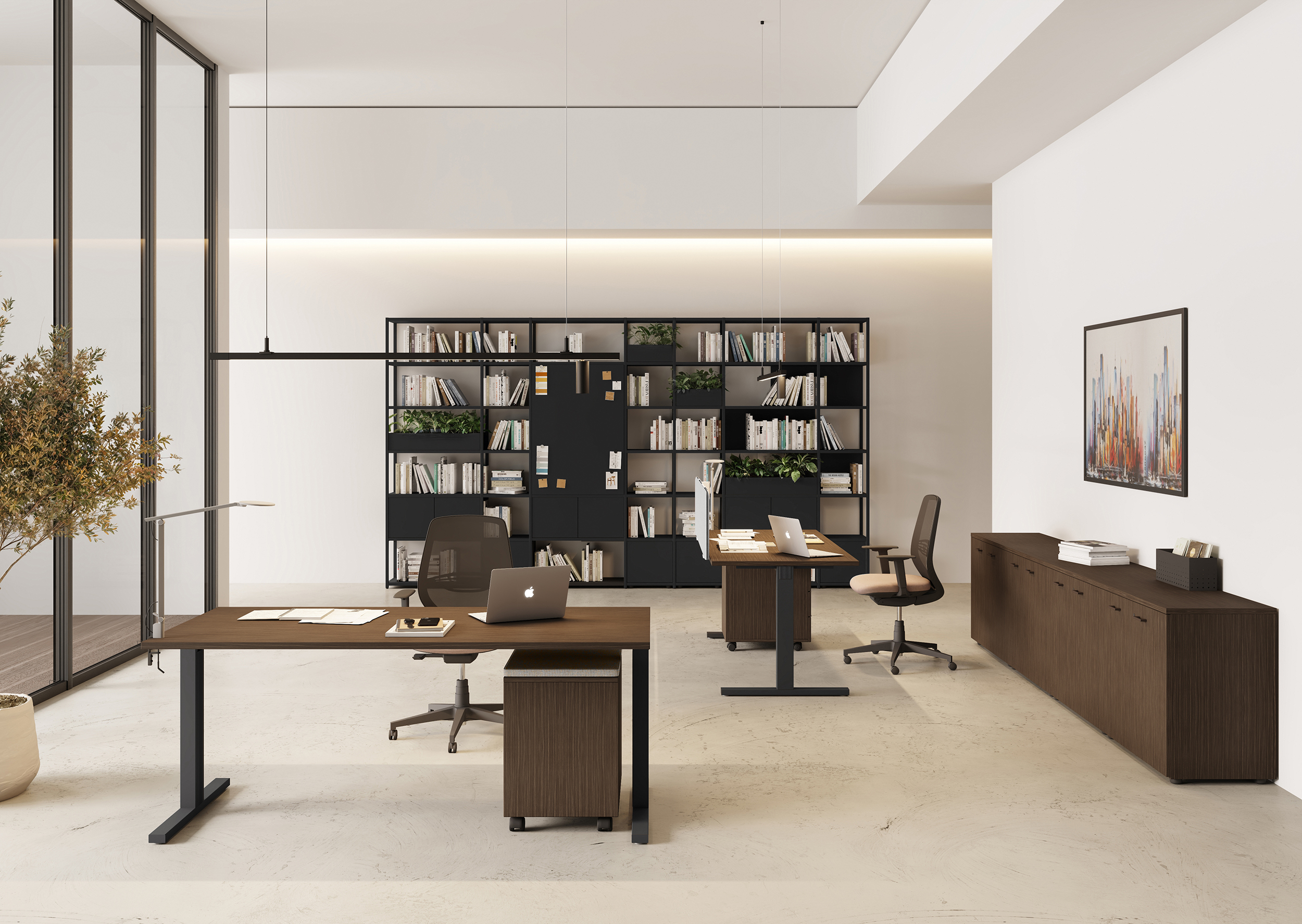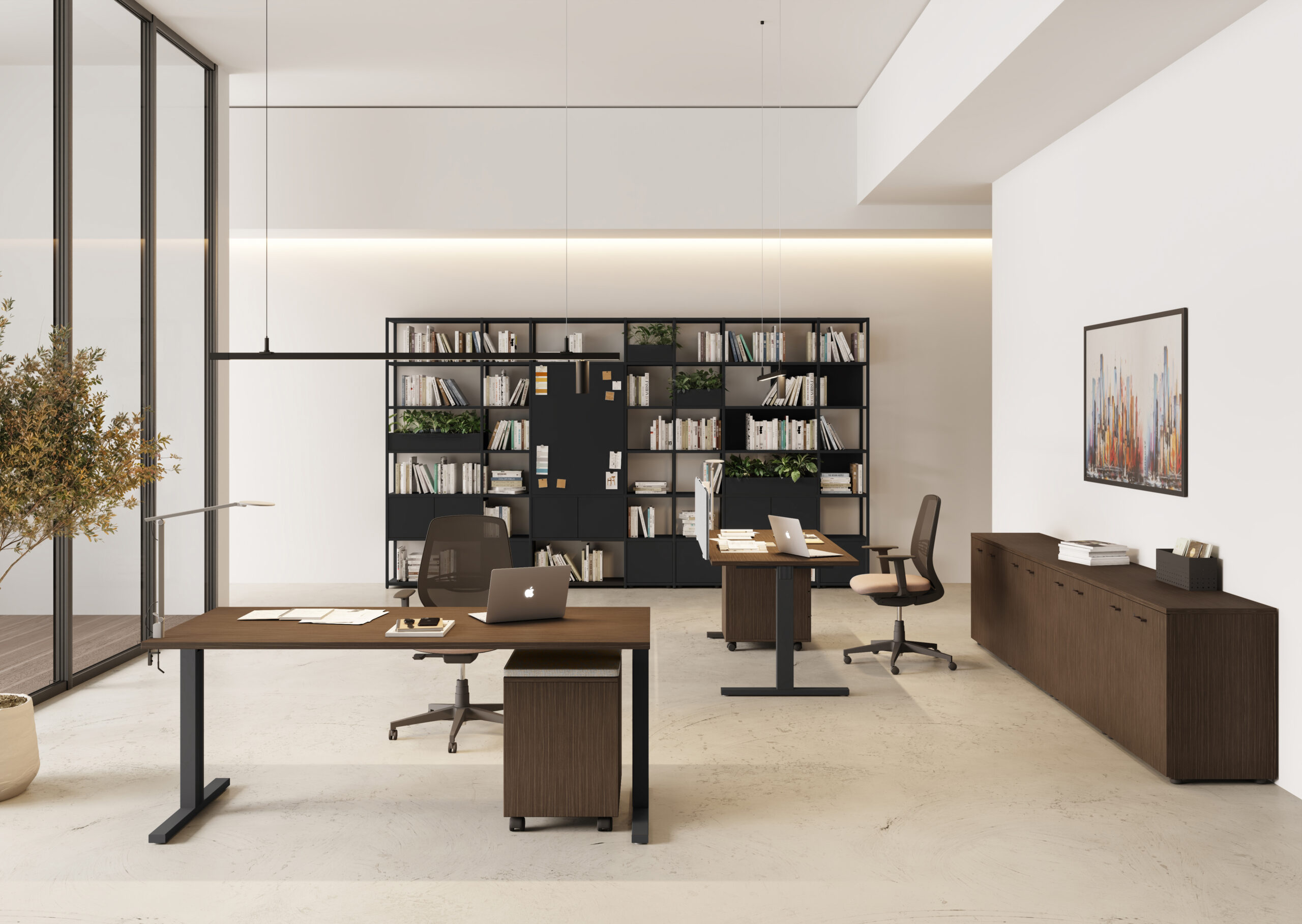 - Rangements Comby en 2 hauteurs, autonomes et intégrés avec le bureau.