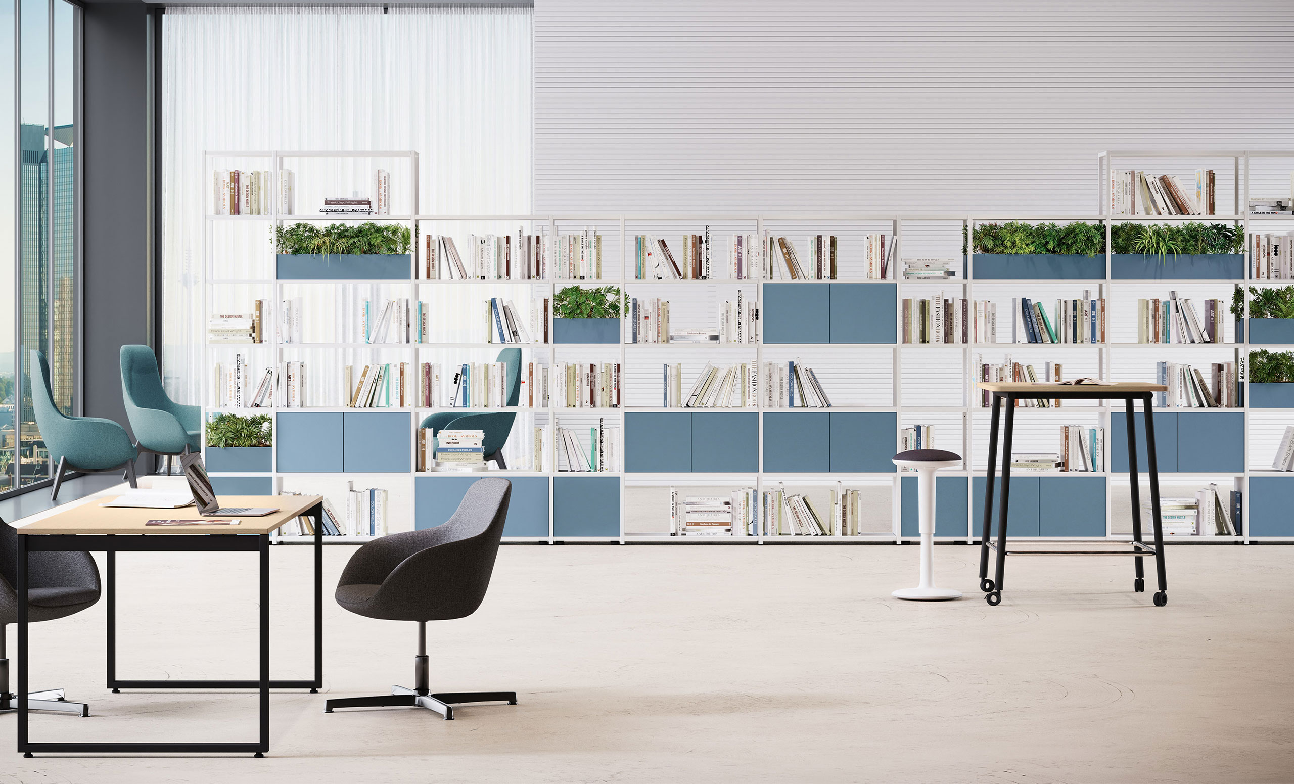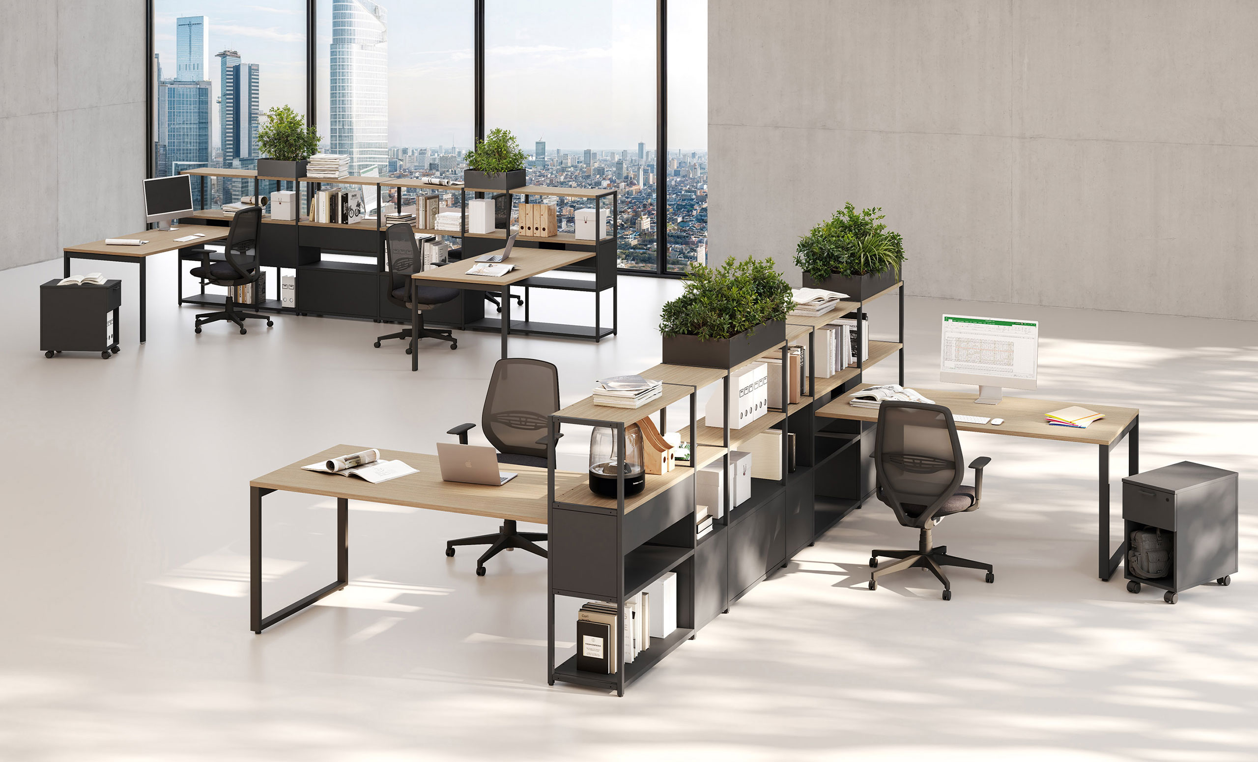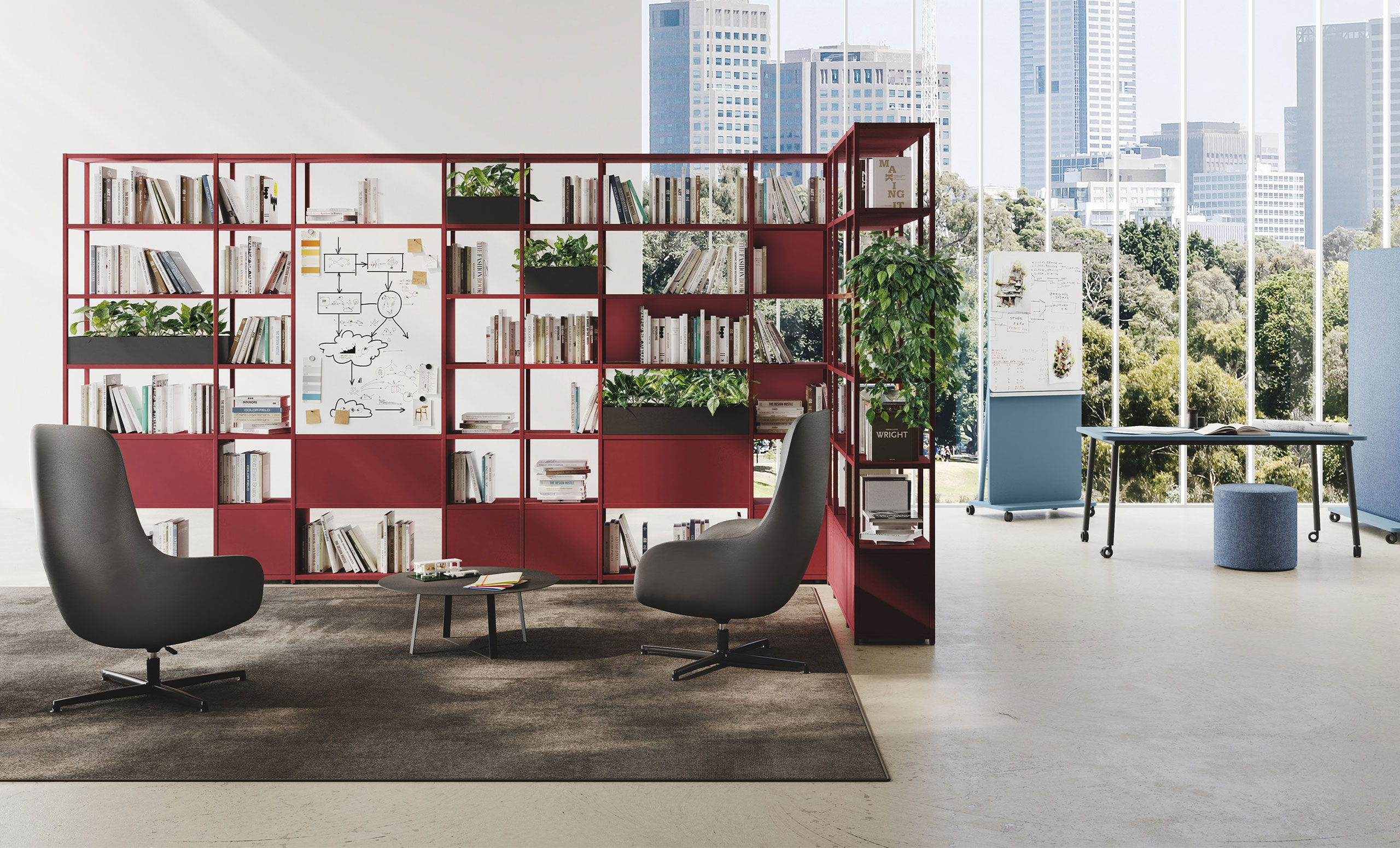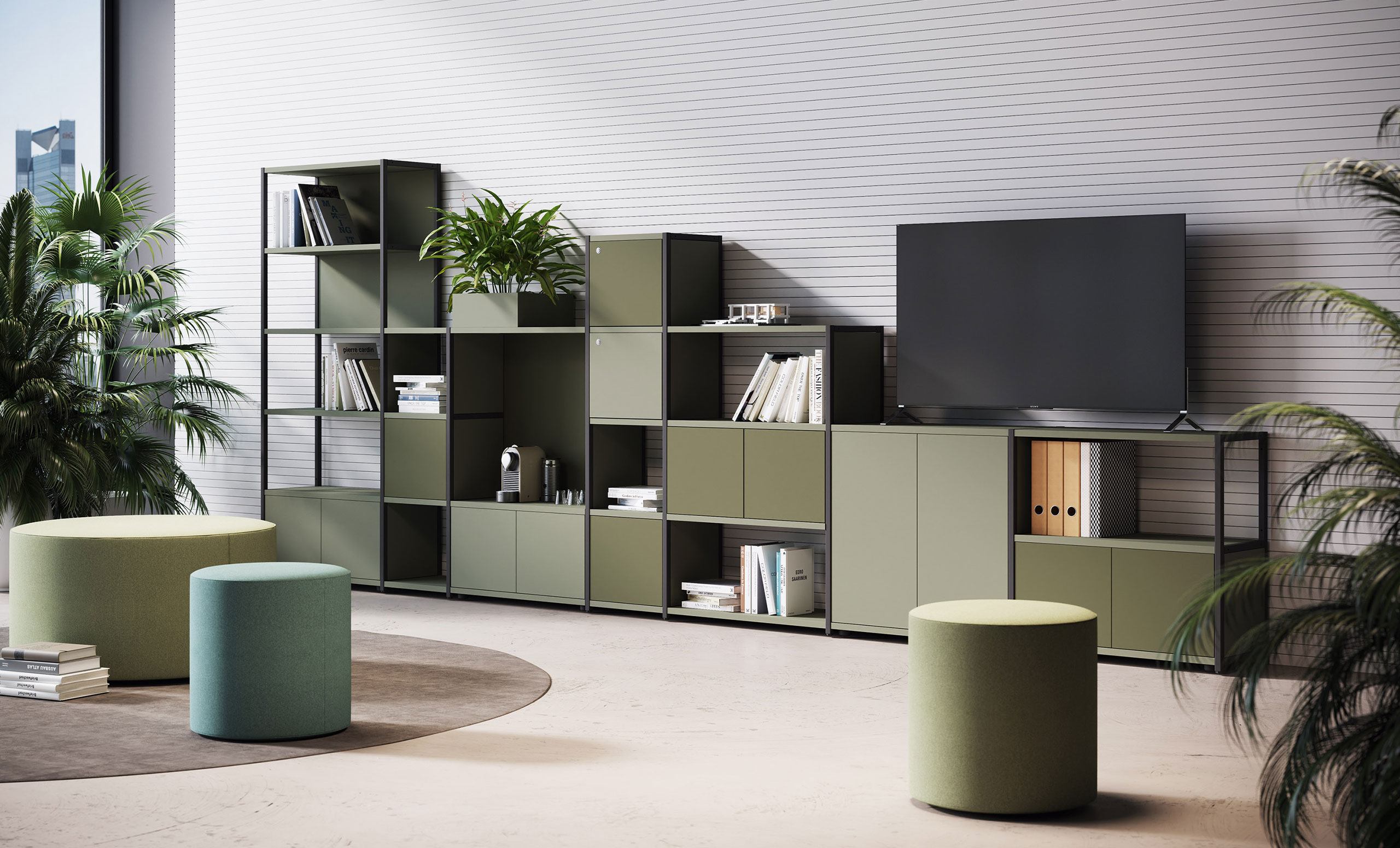 Il suo sistema modulare e componibile, accompagnato dalle quattro altezze dei fianchi e da schienali e fianchetti, consente di progettare in piena libertà composizioni con nicchie aperte e chiuse.