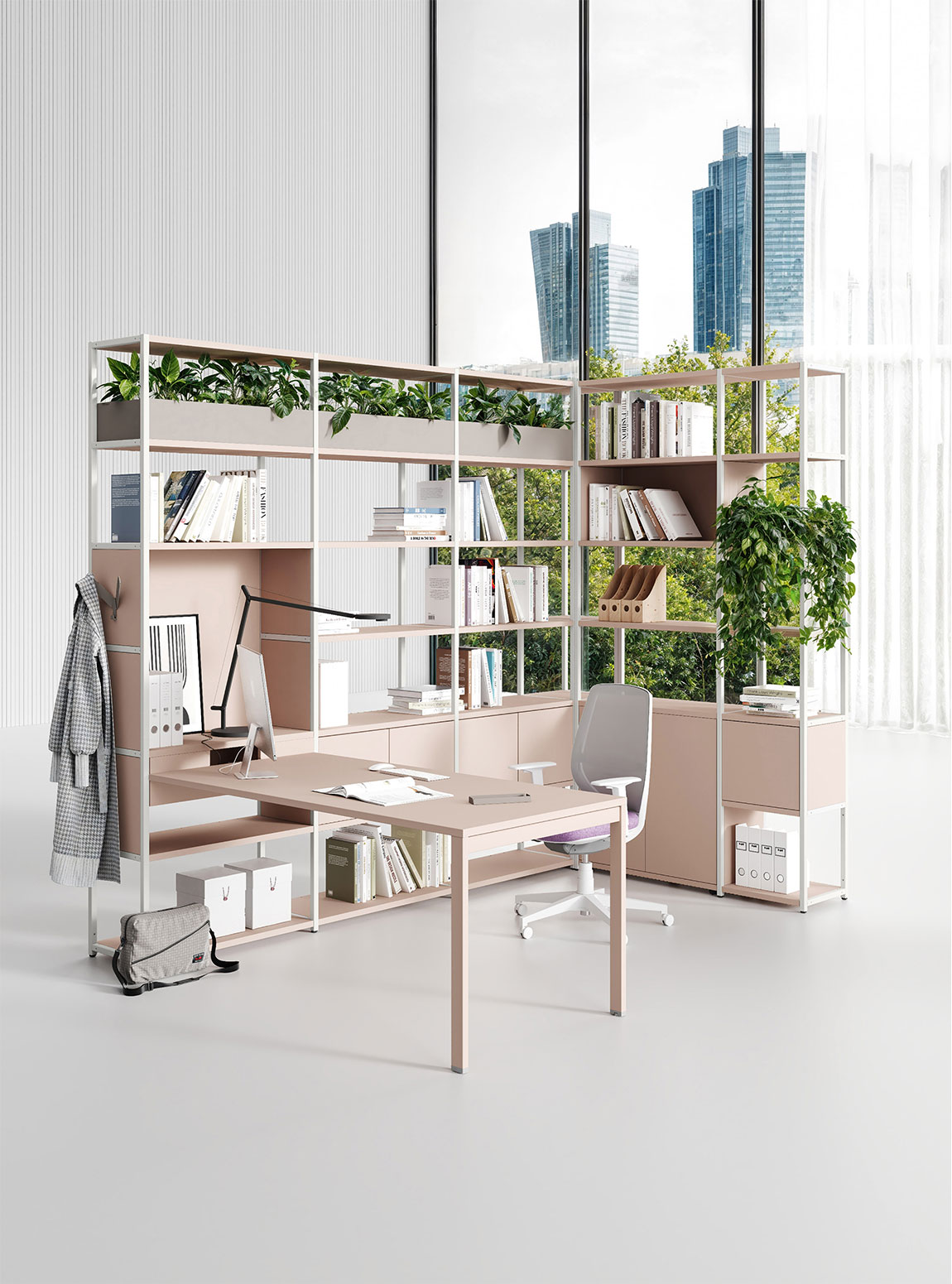 Una libreria leggera, semplice, essenziale che assume unicità e personalità grazie ai colori, coordinati e combinabili, della sua struttura metallica e dei suoi contenitori e ripiani in legno.