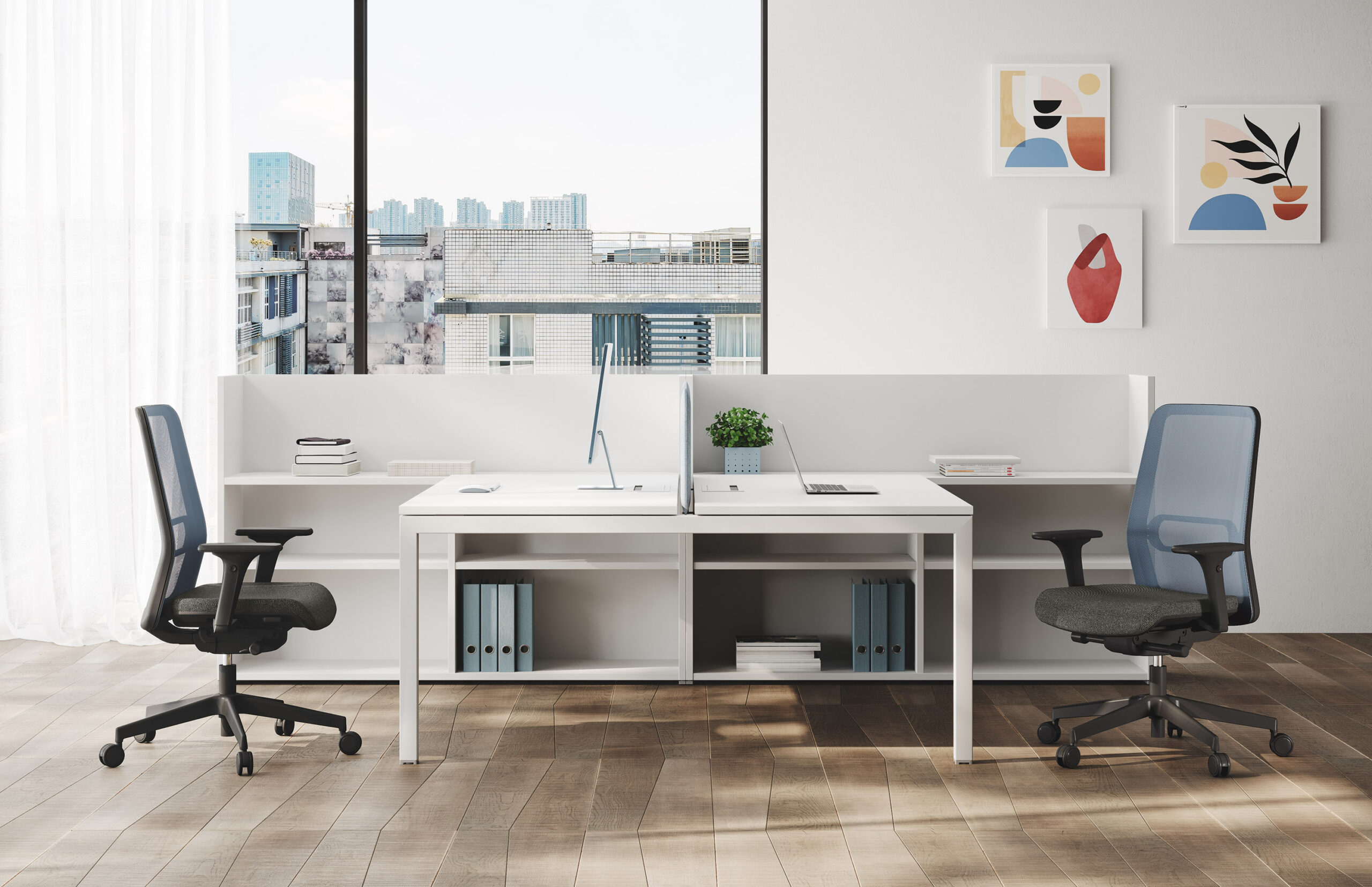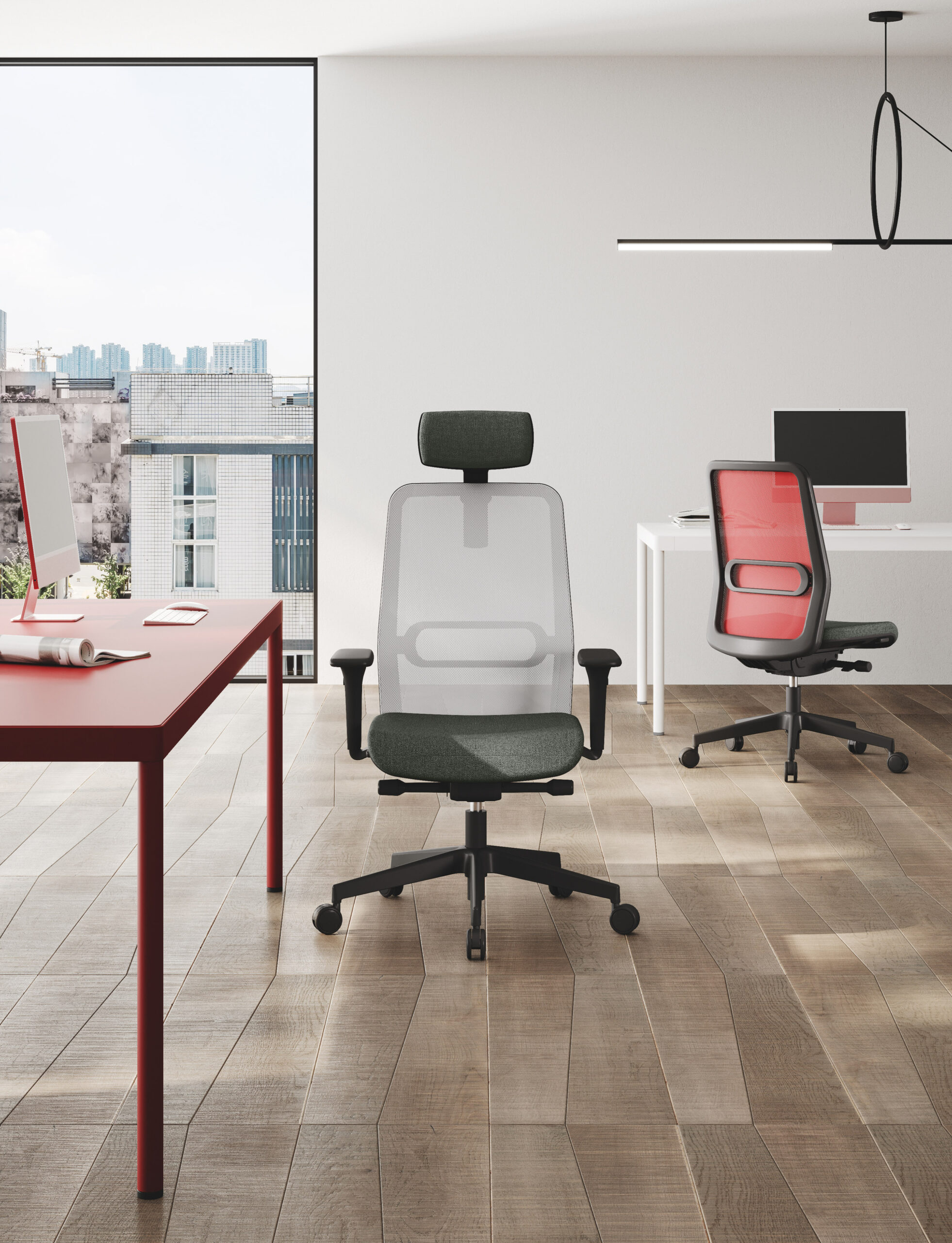Essai si pone come sintesi di questi obiettivi grazie al valore stilistico ed ergonomico delle poltroncine con schienale in rete, esprimendo con forza valori formali e funzionali.