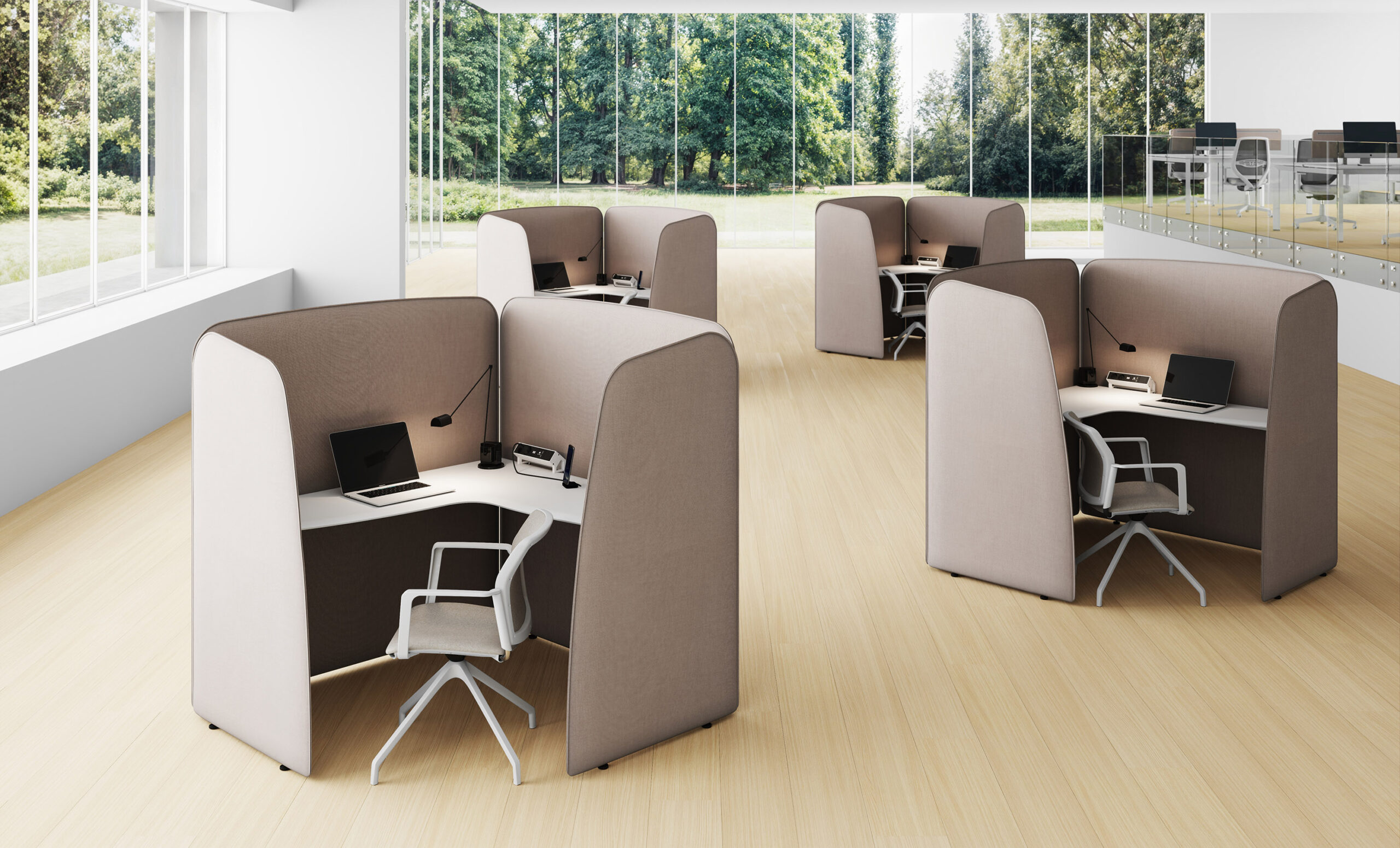 Le postazioni di lavoro tradizionali diventano angoli riservati ad alto comfort acustico.