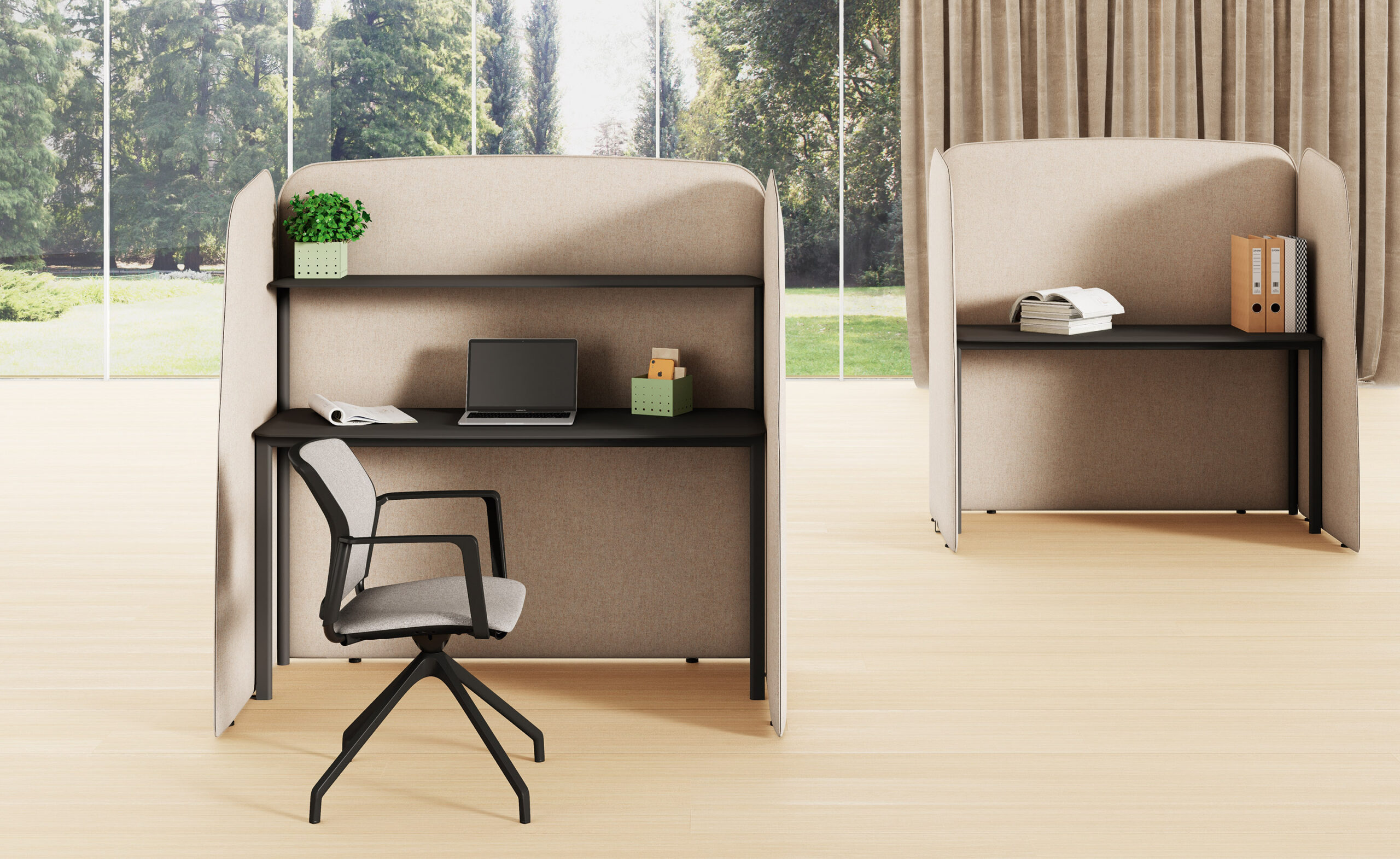 Le postazioni di lavoro diventano isole di concentrazione all’interno di spazi caotici e affollati. I pannelli acustici in tessuto proteggono completamente l’operatore.