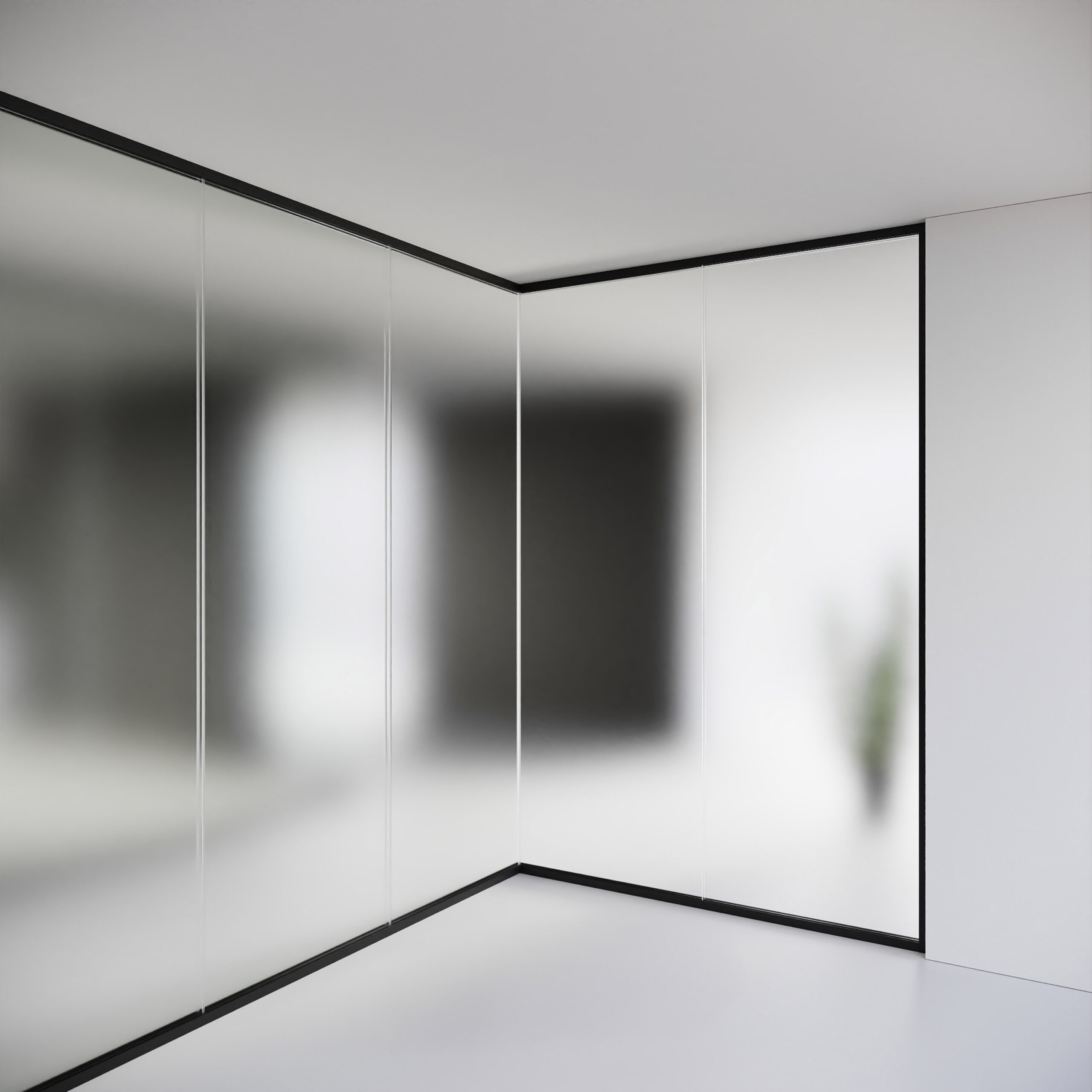 Parete doppio vetro che accoglie lastre autoportanti da 10/11 o 12/13 mm, studiata per ottenere elevate prestazioni di abbattimento acustico, mantenendo uno spessore di soli 50 mm. Si integra perfettamente con le altre versioni di Mood impiegandone tutti gli accessori, connessioni tra moduli vetrati e porte a battente e scorrevoli.