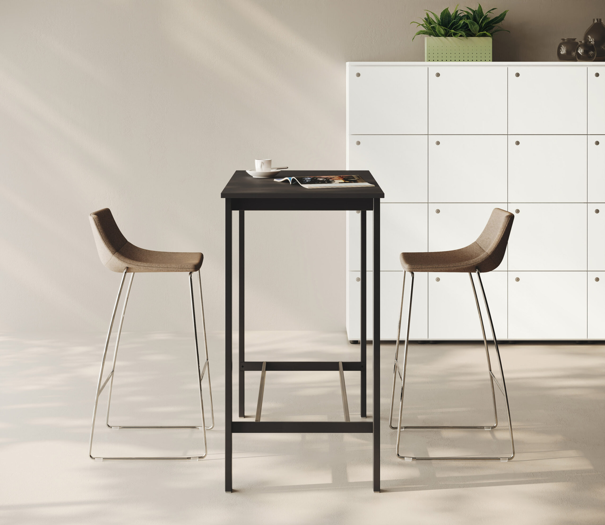 Tavolo break alto con piano rettangolare in legno o vetro e struttura metallica a gambe perimetrali e barre poggiapiedi.