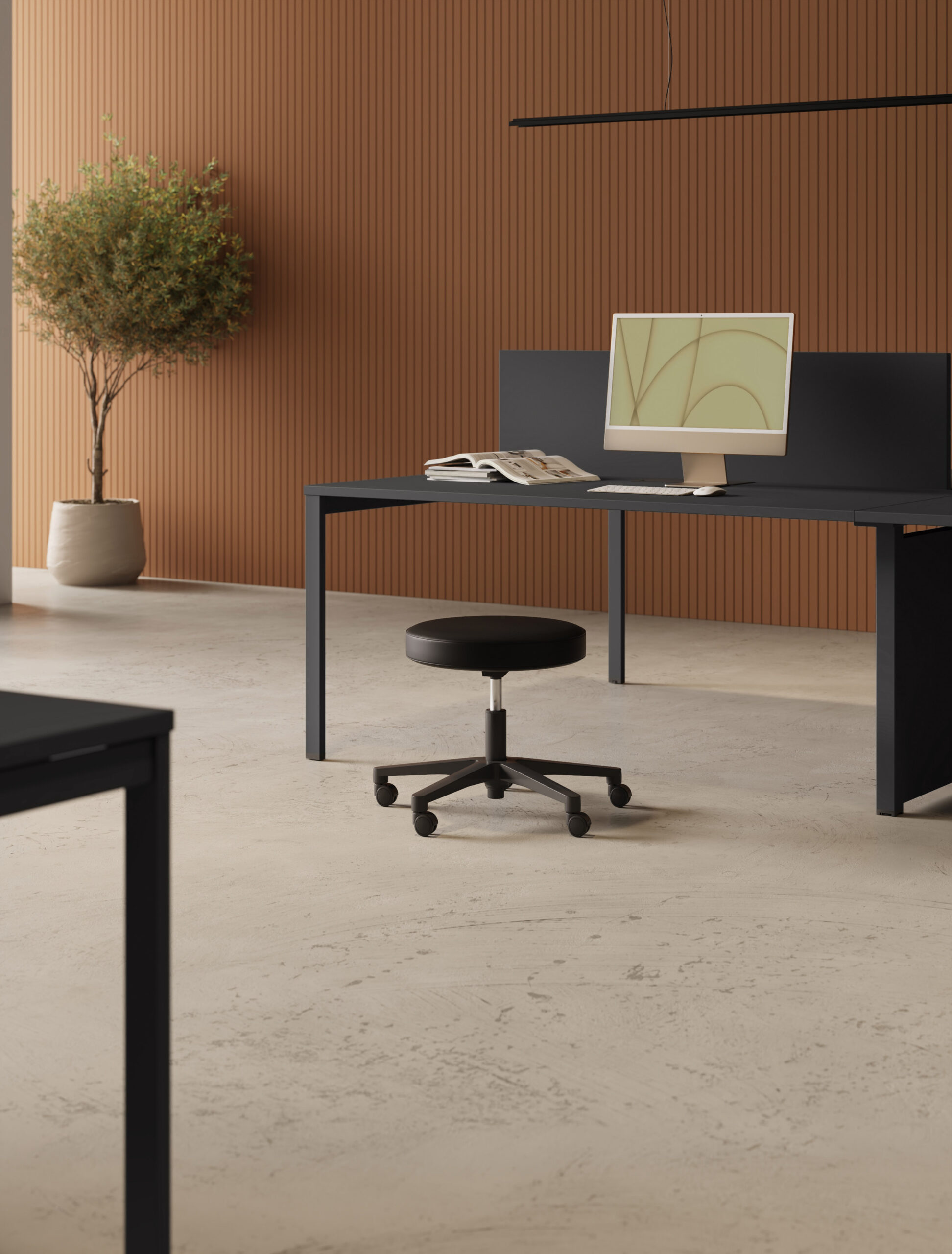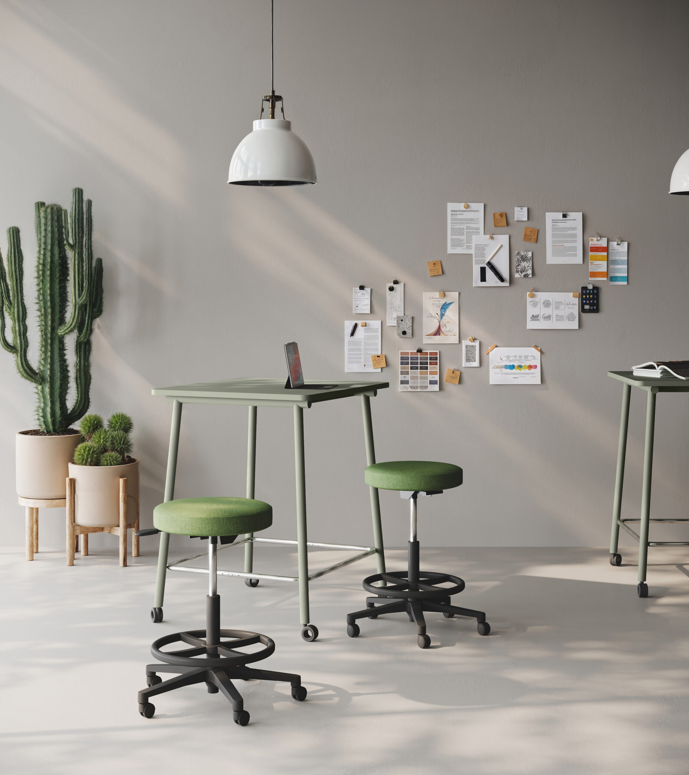 Uno sgabello versatile pensato per contesti dinamici. Disponibile con base fissa o su ruote, si presenta in versione alta con poggiapiedi oppure bassa, a seconda delle esigenze ergonomiche.