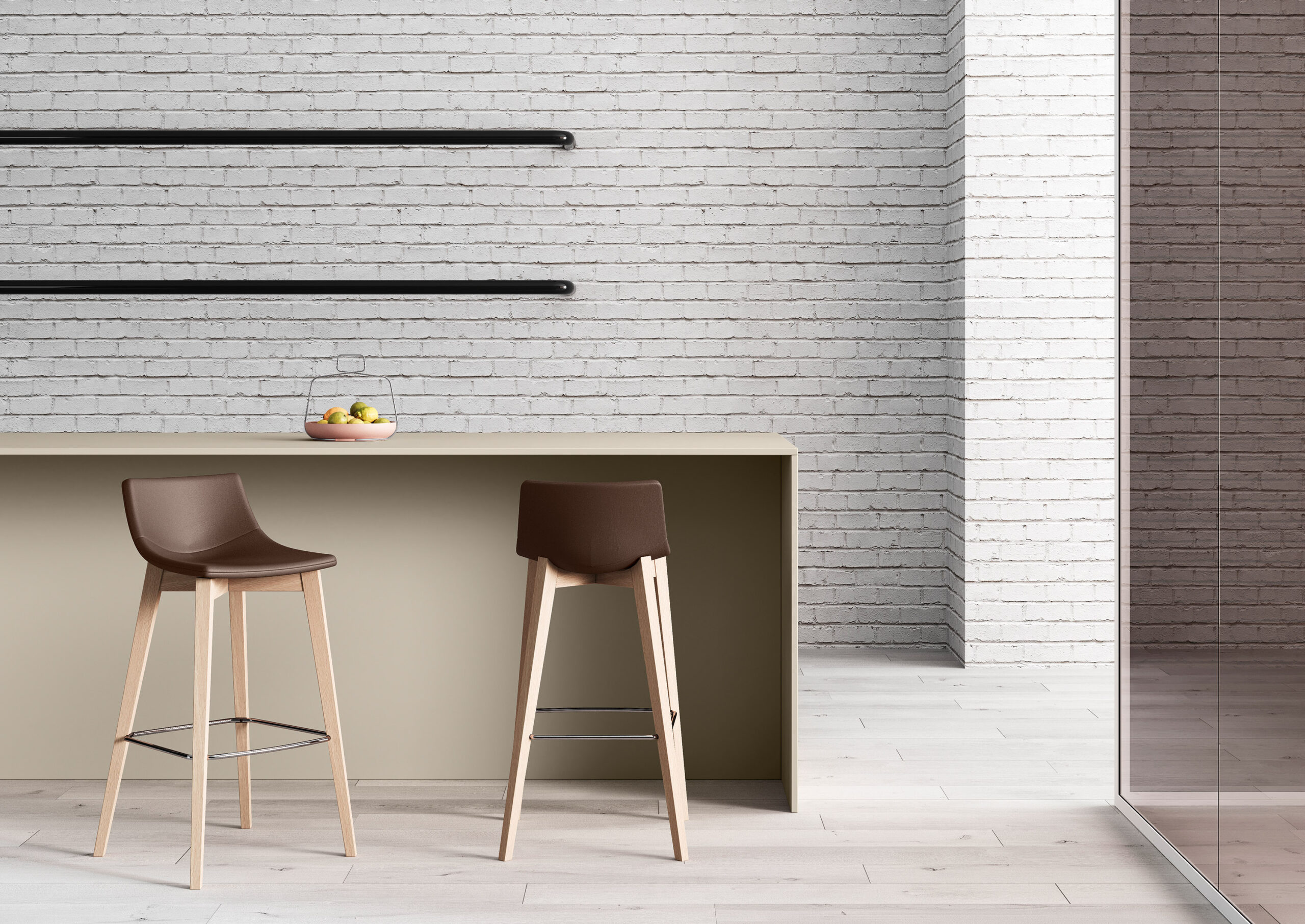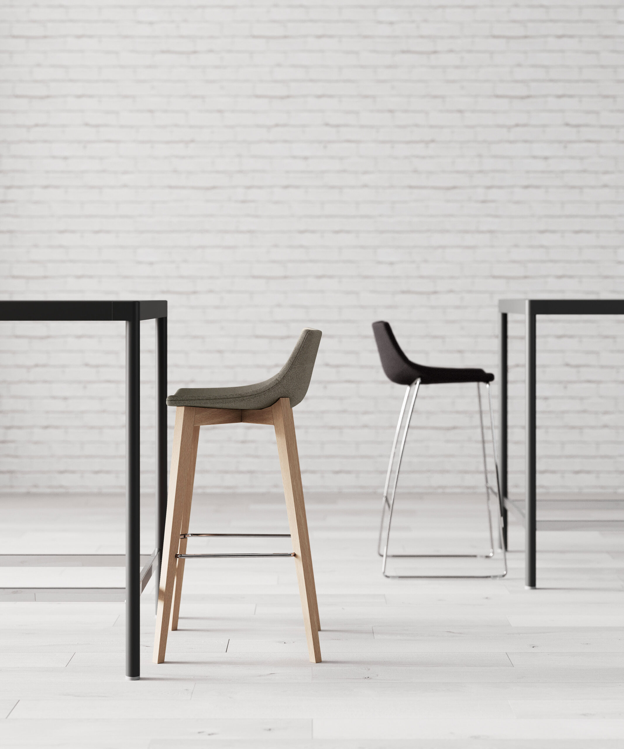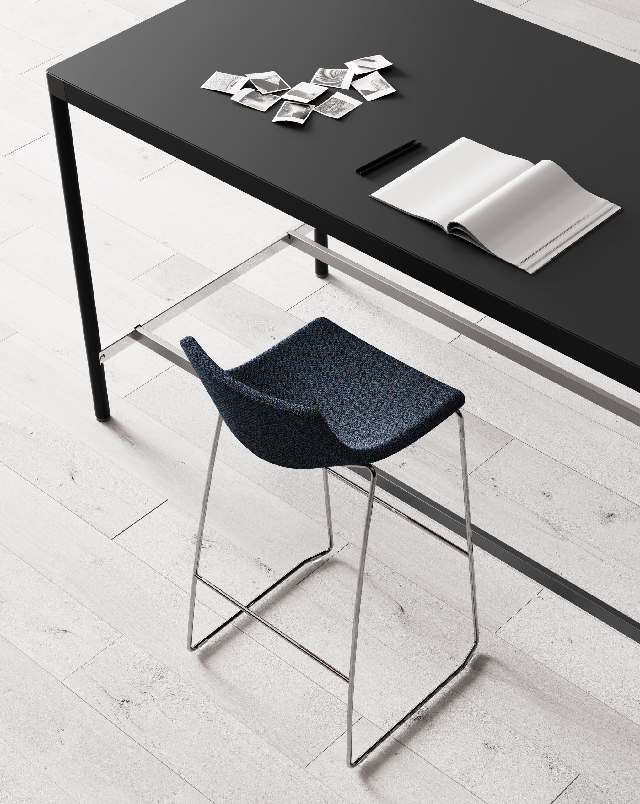 Lo sgabello caratterizza gli spazi per la riunione veloce o per la pausa. L’oggetto e l’atmosfera che contribuisce a creare cambiano in base all’abbinamento delle diverse basi, in filo di acciaio o in legno, con le sedute imbottite nei vari rivestimenti.