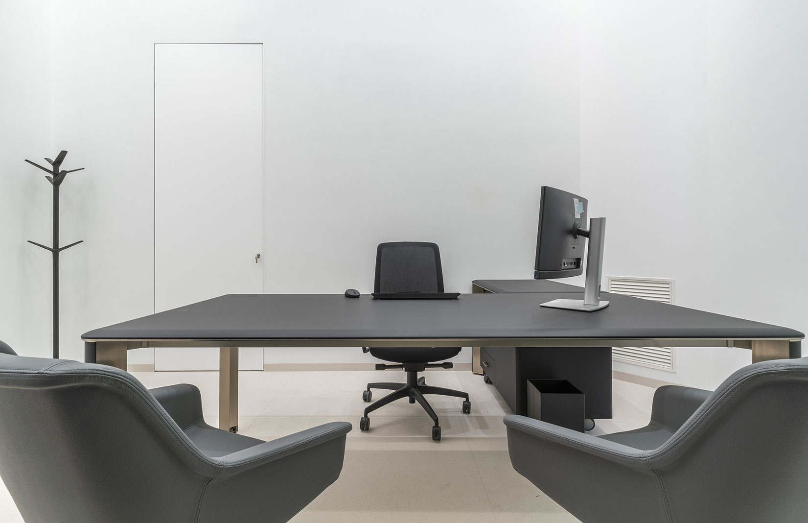 Per gli arredi e le pareti attrezzate è stata scelta Las, per rigore formale, eleganza e sobrietà: Pareti attrezzate Box e divisorie Over, a tutt’altezza, completamente customizzate, sistemi semidirezionali e operativi della collezione “Fil Rouge”, sistemi direzionali “Iulio”, sedute direzionali “Jera” e operative “Oscar” ed F04.